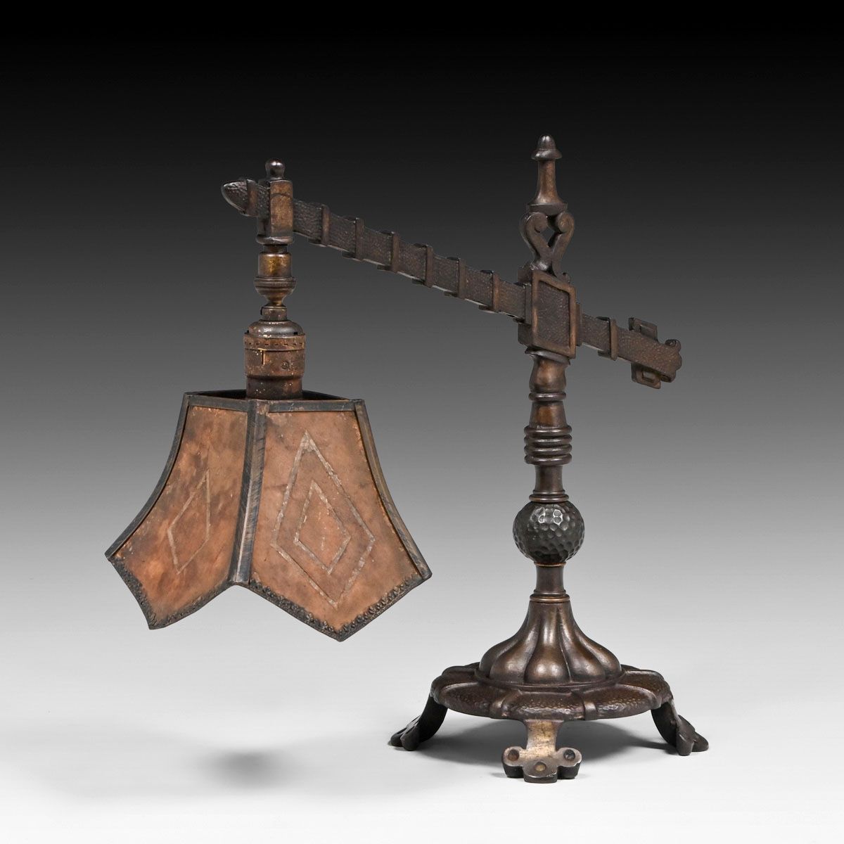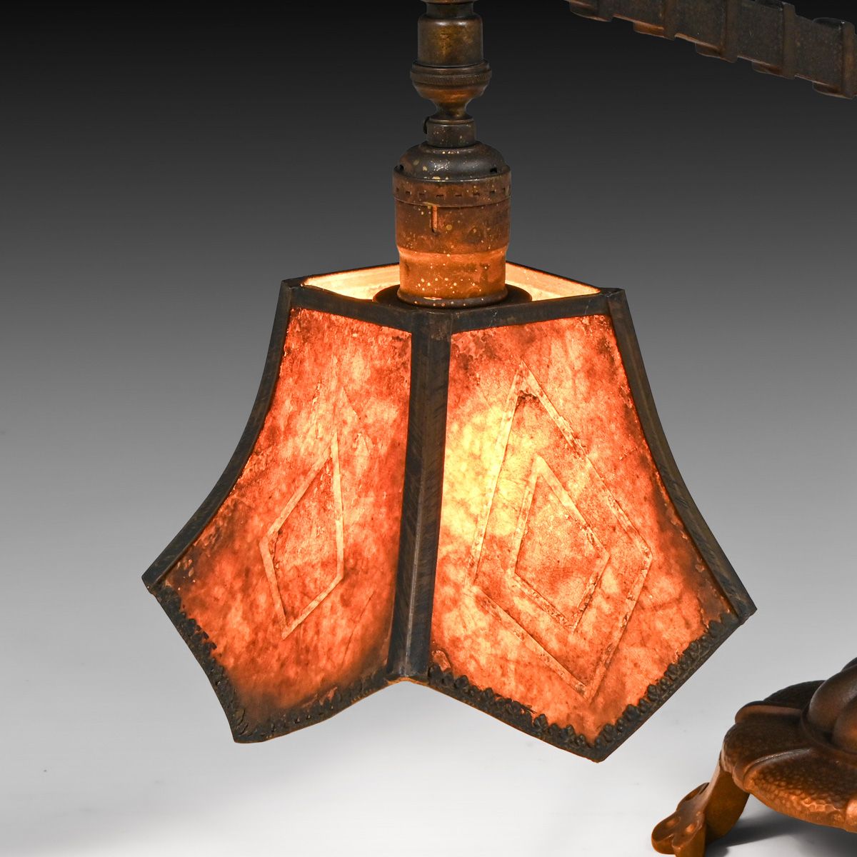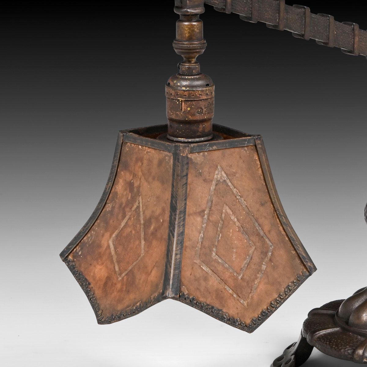 Rembrandt Mica Bridge Lamp c1920. Signed. Excellent original mica. Excellent original patina. 14.25"h x 14.5" x 7.5"d base