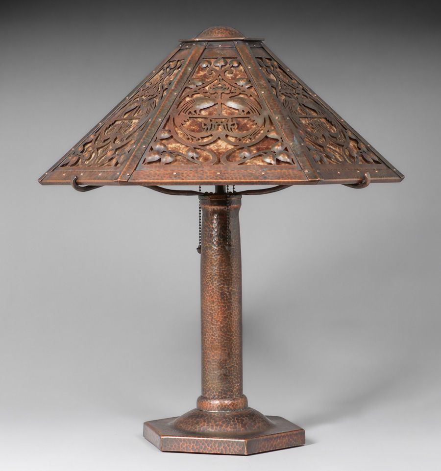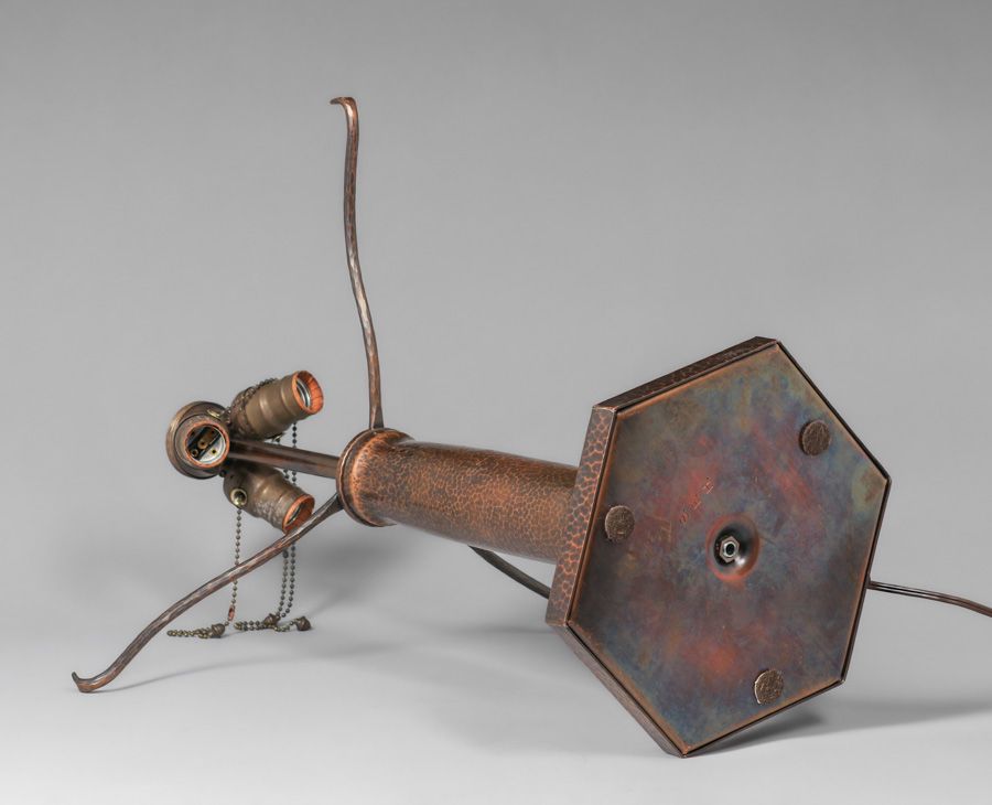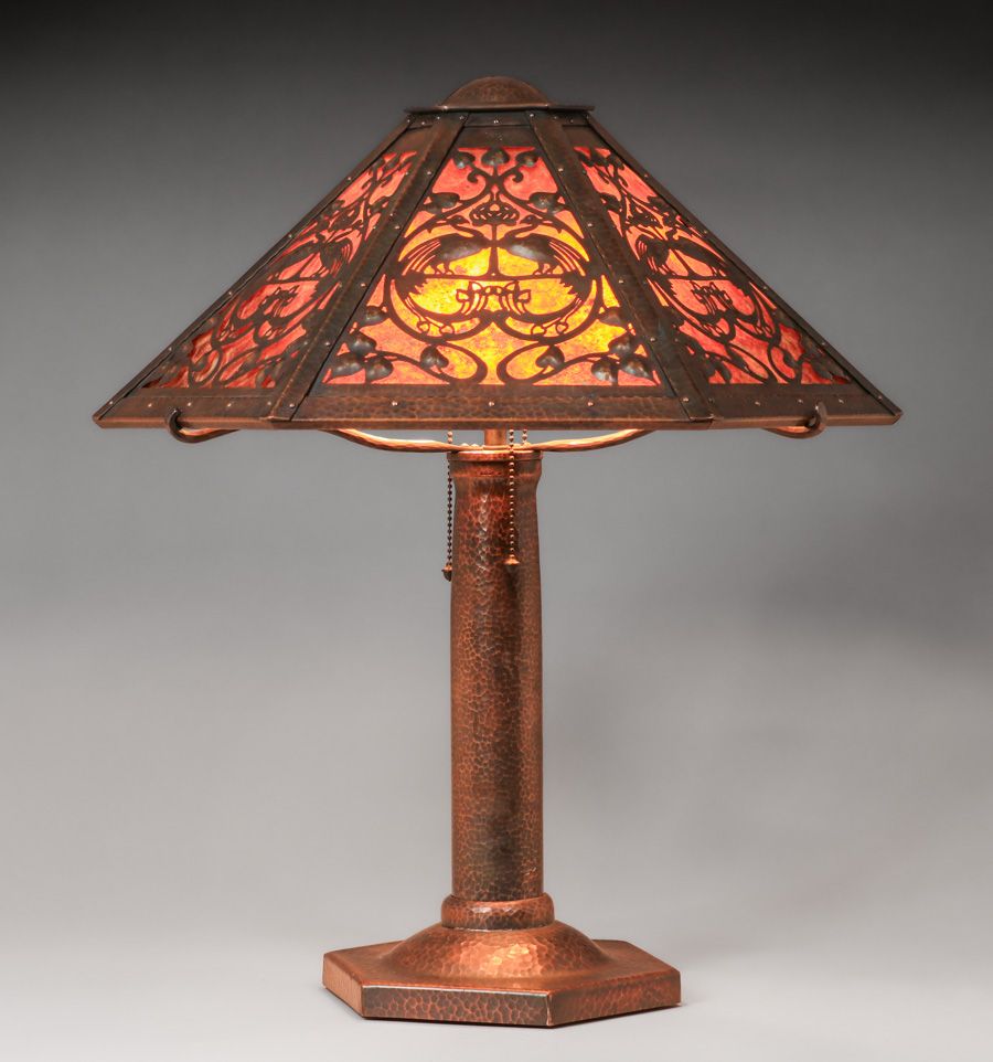 Contemporary Steve Helberg Hammered Copper & Mica Peacock Cutout Lamp c2010. Signed “S.F.H.”. Excellent condition. 25″h x 22″d $5500