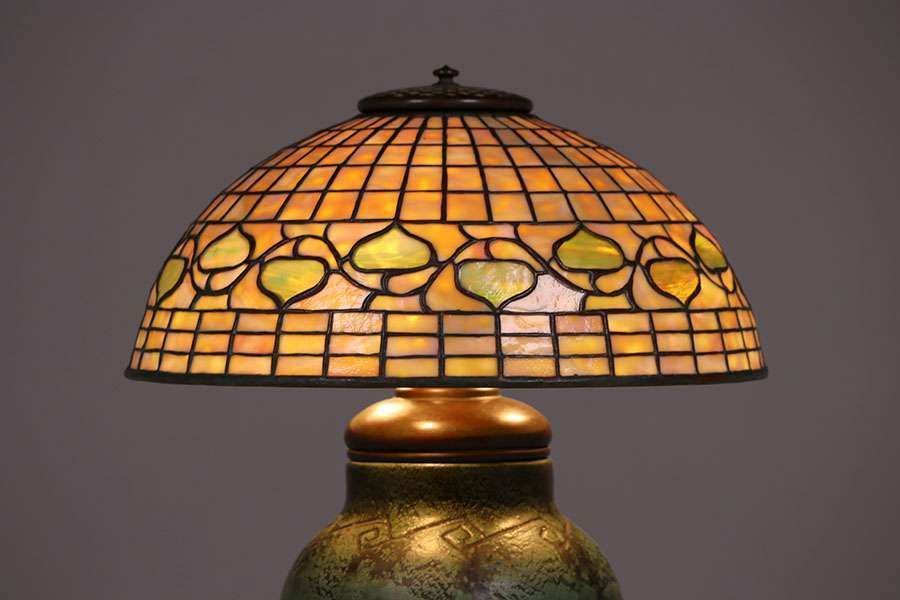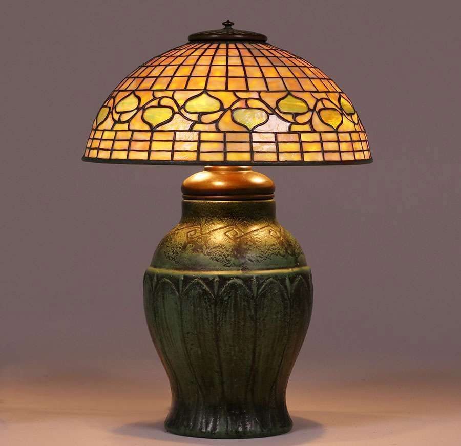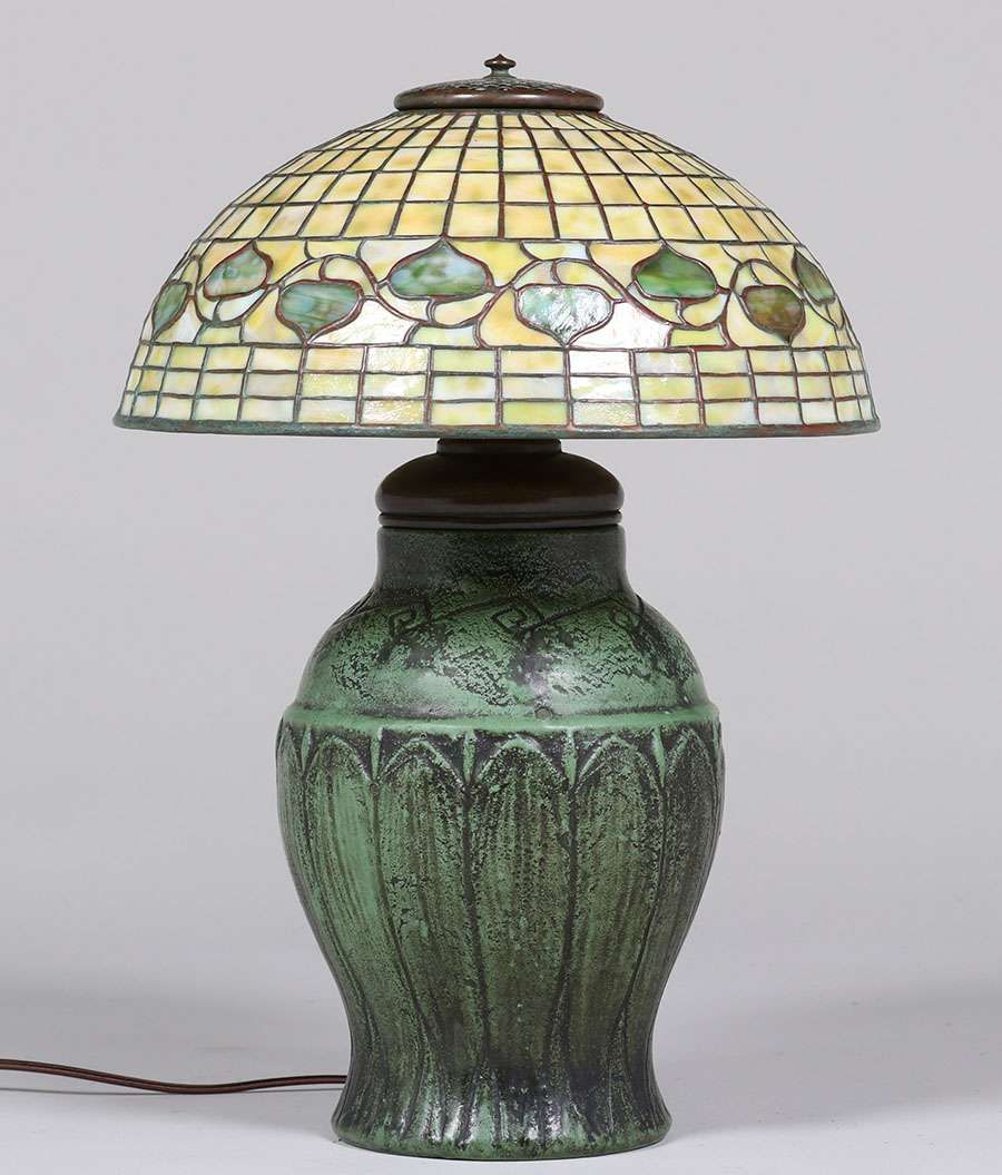 - Tiffany Studios Leaded Glass Acorn Lamp Wheatley Pottery Matte Green Base c1910