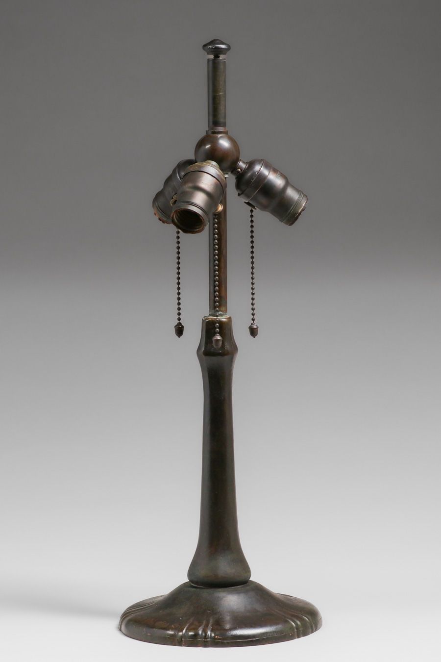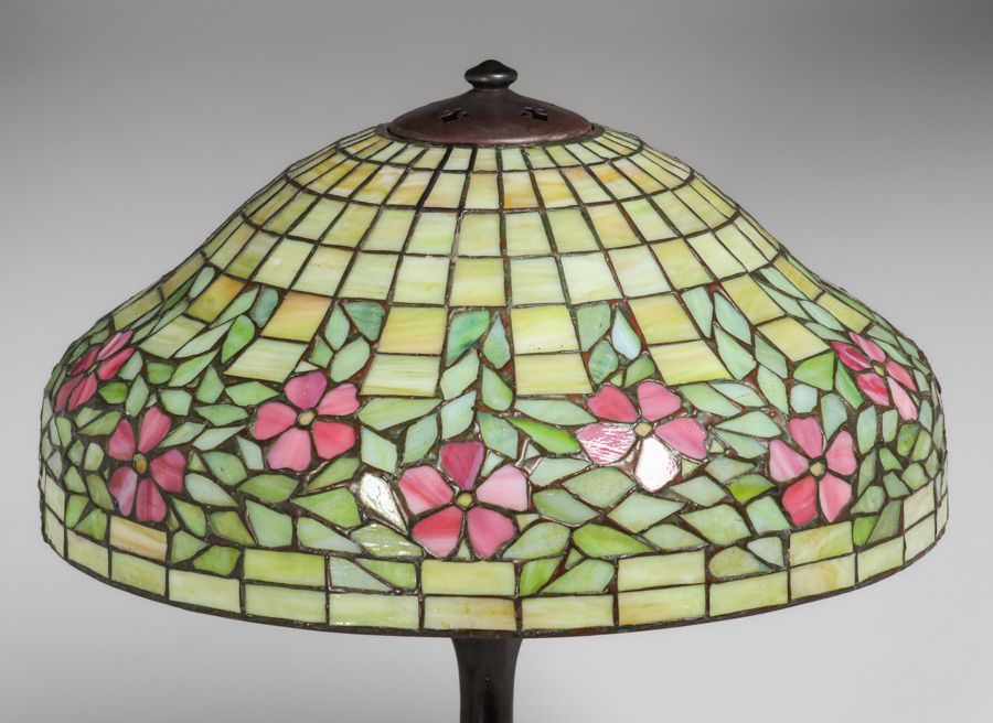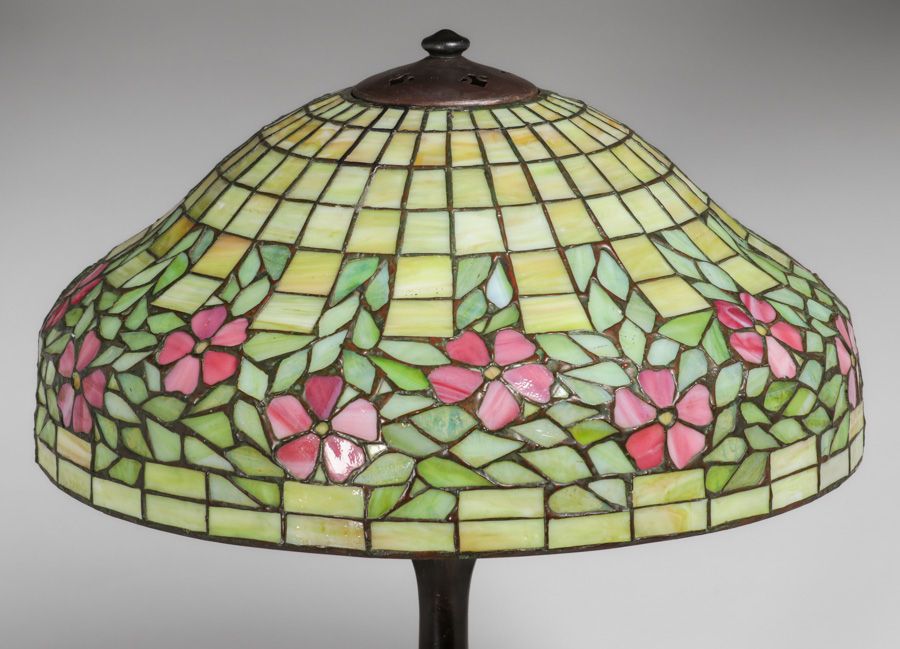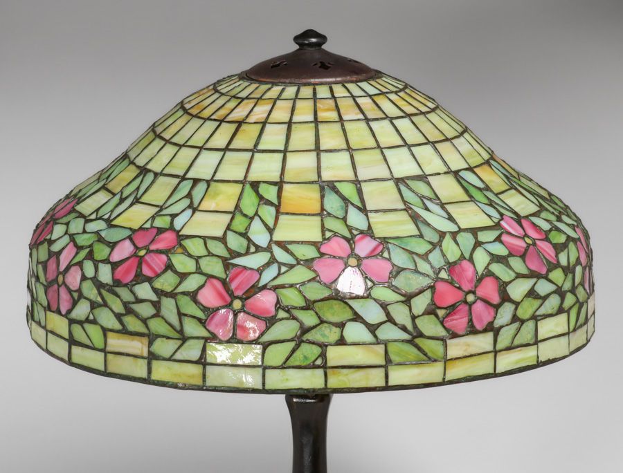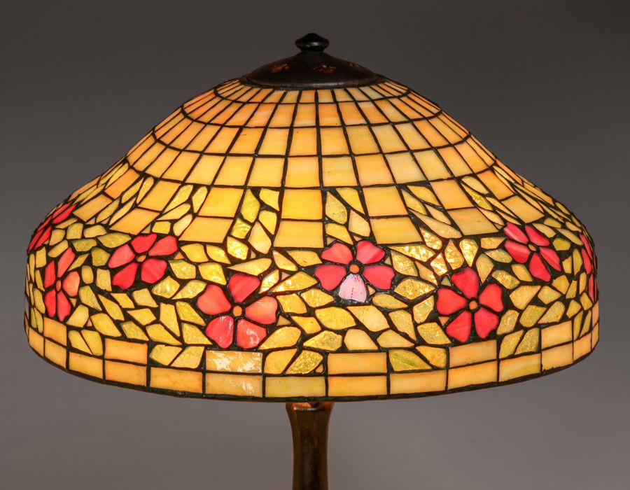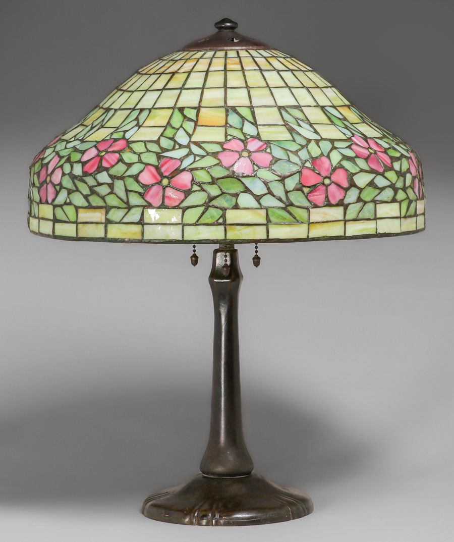 Unique Art Glass and Metal Company , Brooklyn, NY – Periwinkle floral design leaded glass lamp. When Louis Comfort Tiffany’s patent on the copper foil / leaded glass technique expired in 1903, Unique Art Glass and Metal Company was one of several companies that adopted Tiffany’s techniques and competed directly with Tiffany Studios. Unsigned. Excellent condition. Original patina to base. 22"h x 18"w SOLD