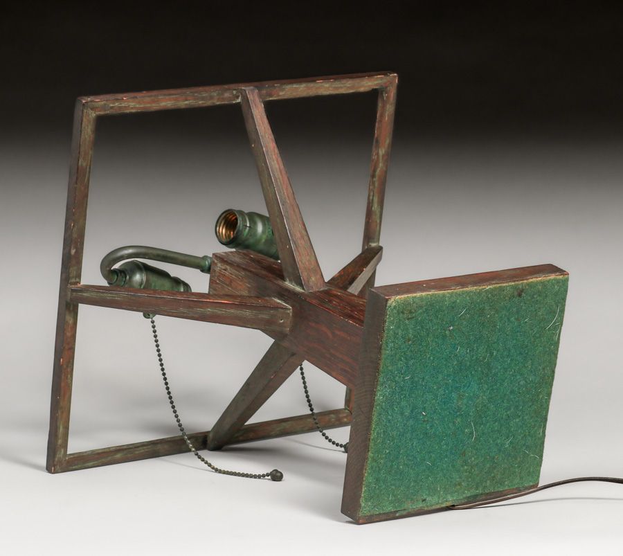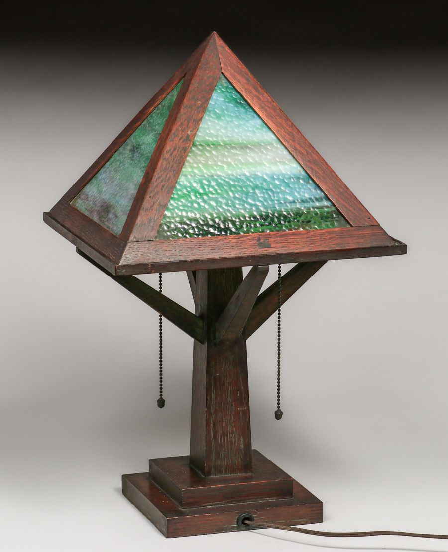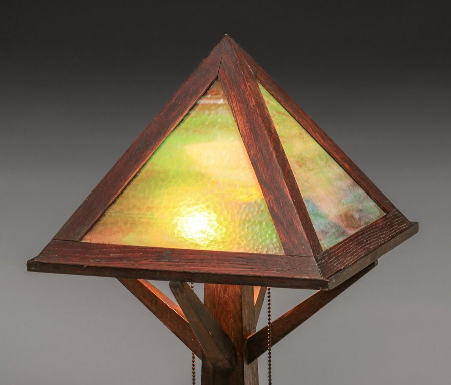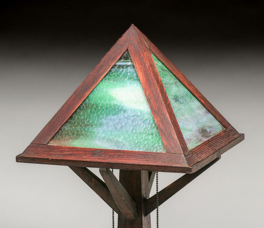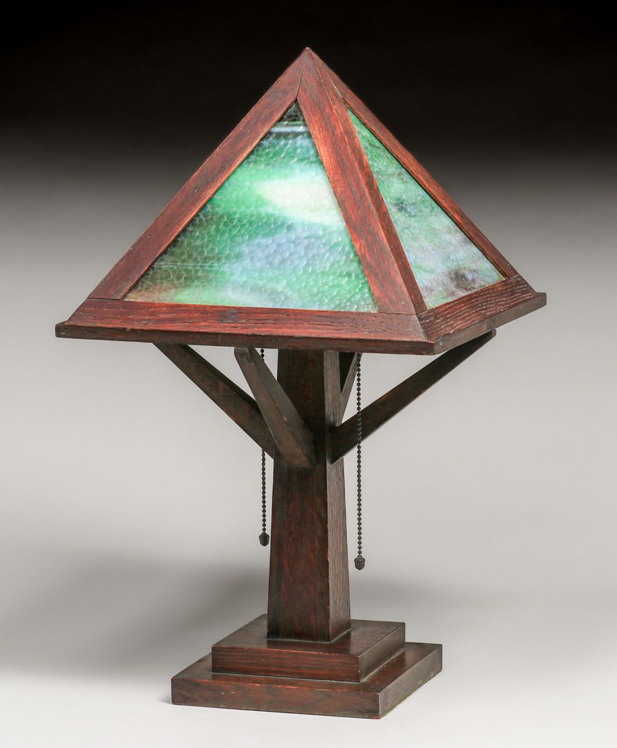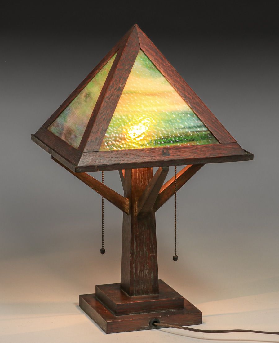 - W.B. Moses & Sons Oak & Slag Glass Lamp c1910