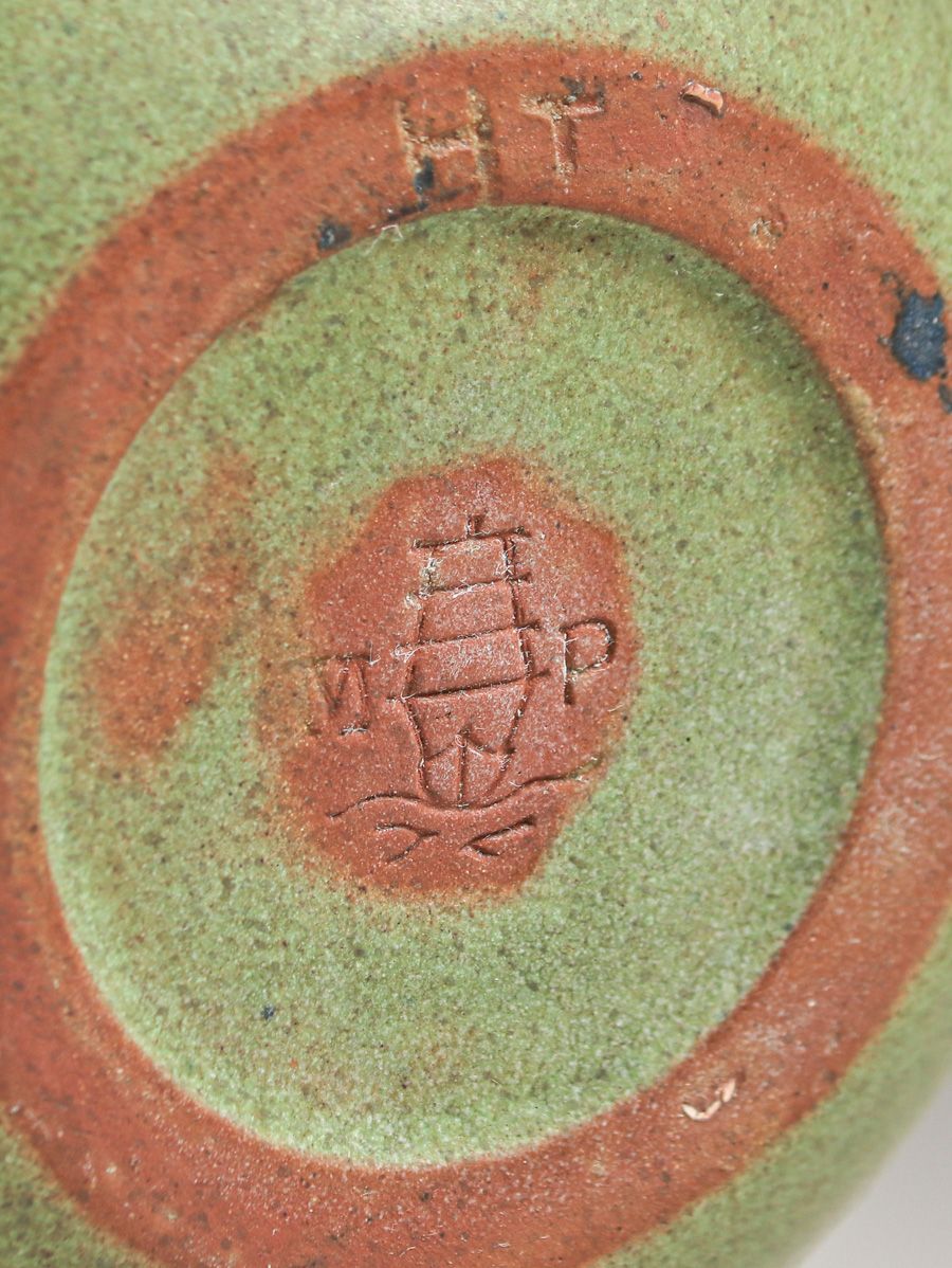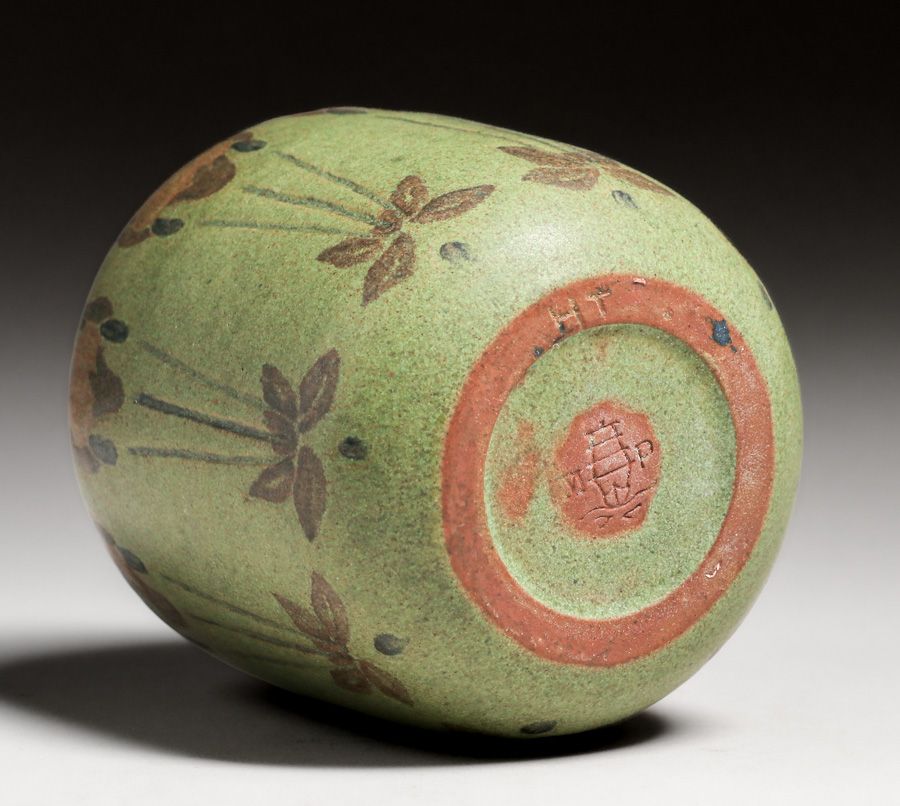 Marblehead Pottery Vase Hannah Tutt c1910. Signed. Invisible professional restoration to small rim chip, otherwise perfect condition. 4.5″h x 4"h SOLD
