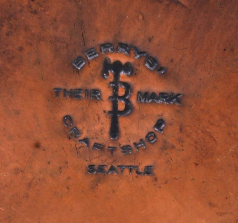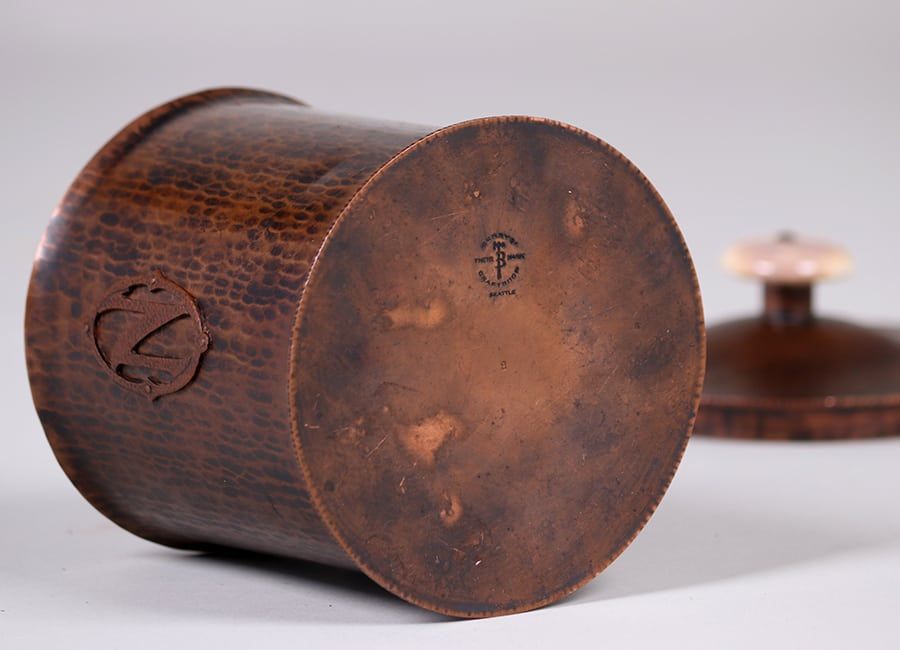 Albert Berry hammered copper canister made in Seattle, WA c1920. Signed. Excellent original patina. 7"h x 5.5"d SOLD