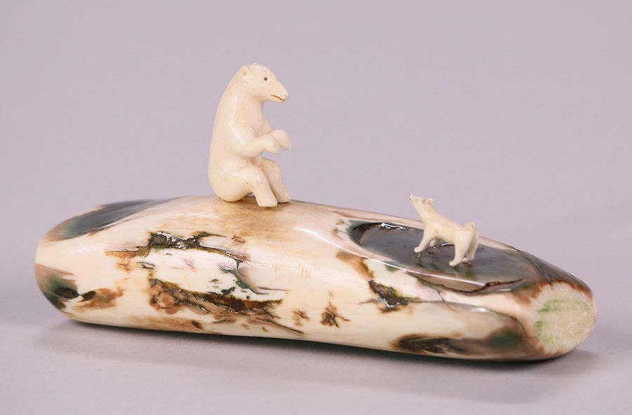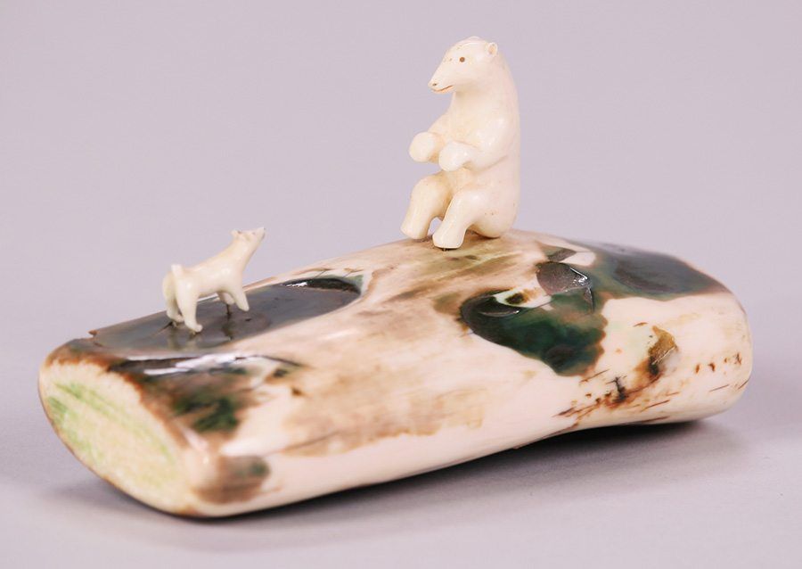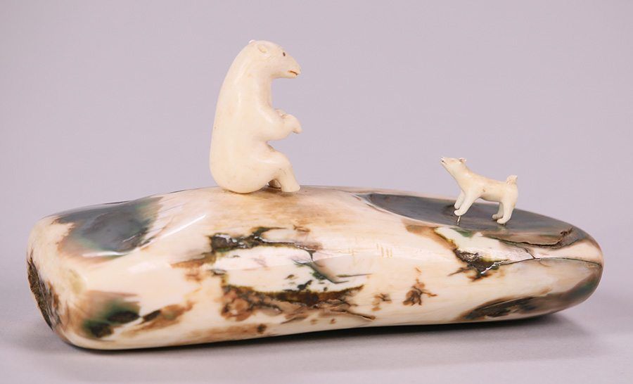Attributed to Albert Berry hand-carved fossilized mastodon tusk with seated Polar bear and dog c1900-1910. Unsigned. 6"w x 3"h x 2.5" SOLD