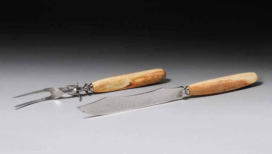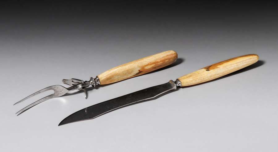 Arts & Crafts Period Carving Set c1910s. Likely made by Albert Berry of Seattle or Juneau, Alaska. Fossilized macedon handles. Unsigned. Excellent condition. Longest 13″ SOLD