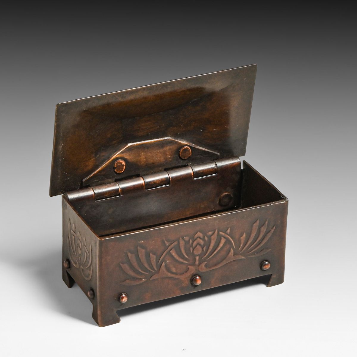 The Art Crafts Shop - Buffalo, NY Acid-Etched Stamp Box c1905. Signed. Excellent new patina. 4"w x 2.25"d x 1.75"h
