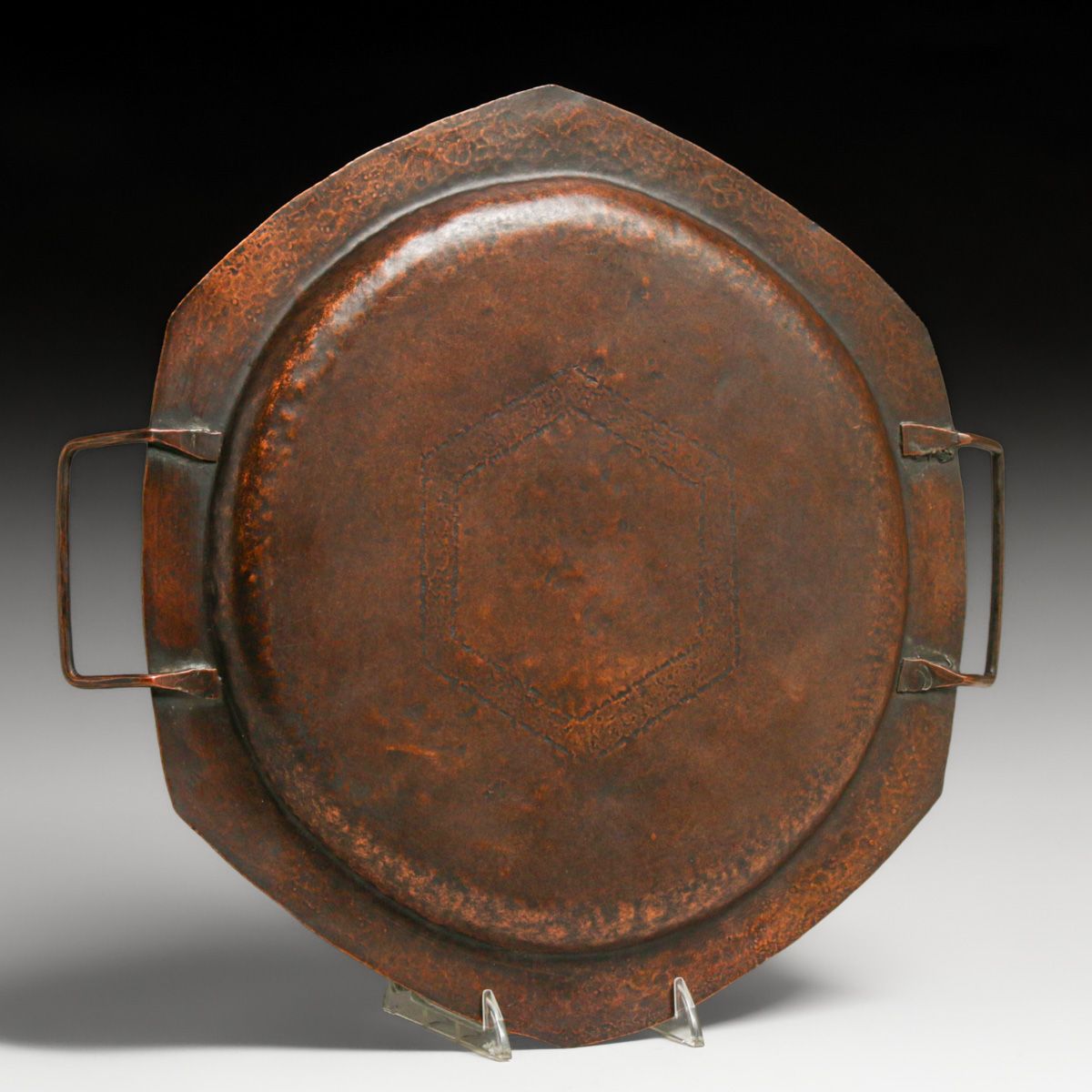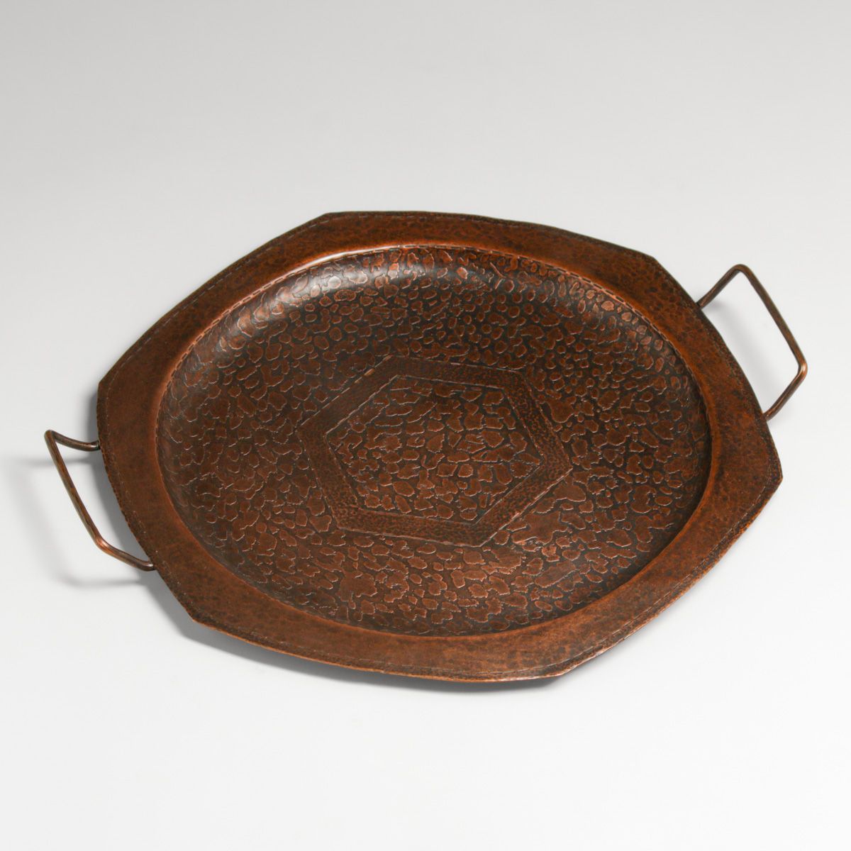 - Arts & Crafts Period Hammered Copper Acid-Etched Two-Handled Tray c1920s