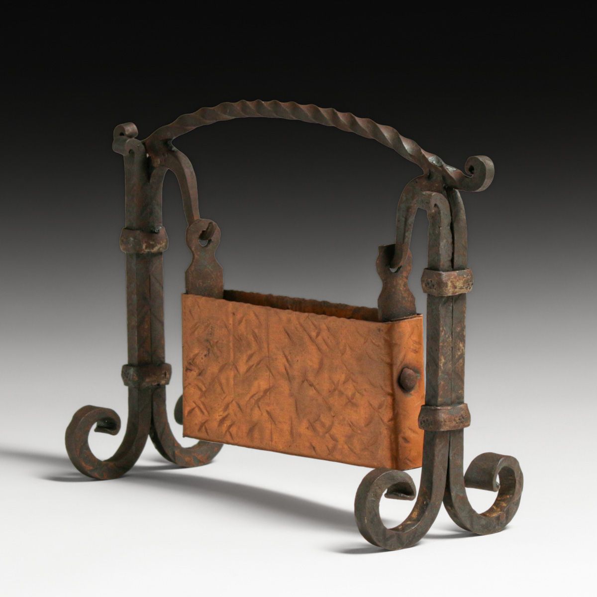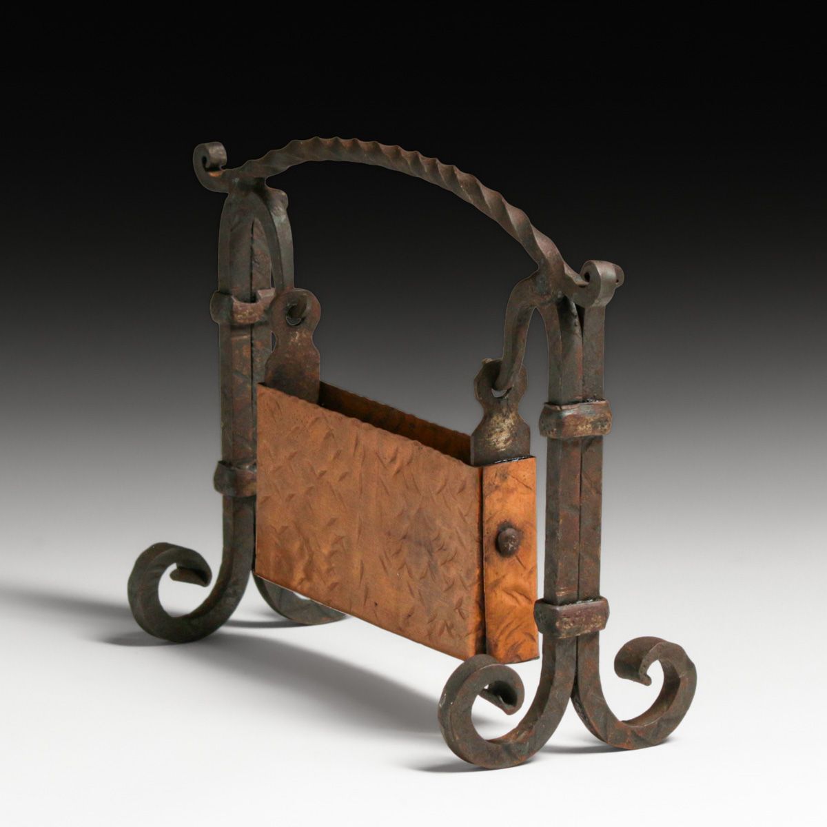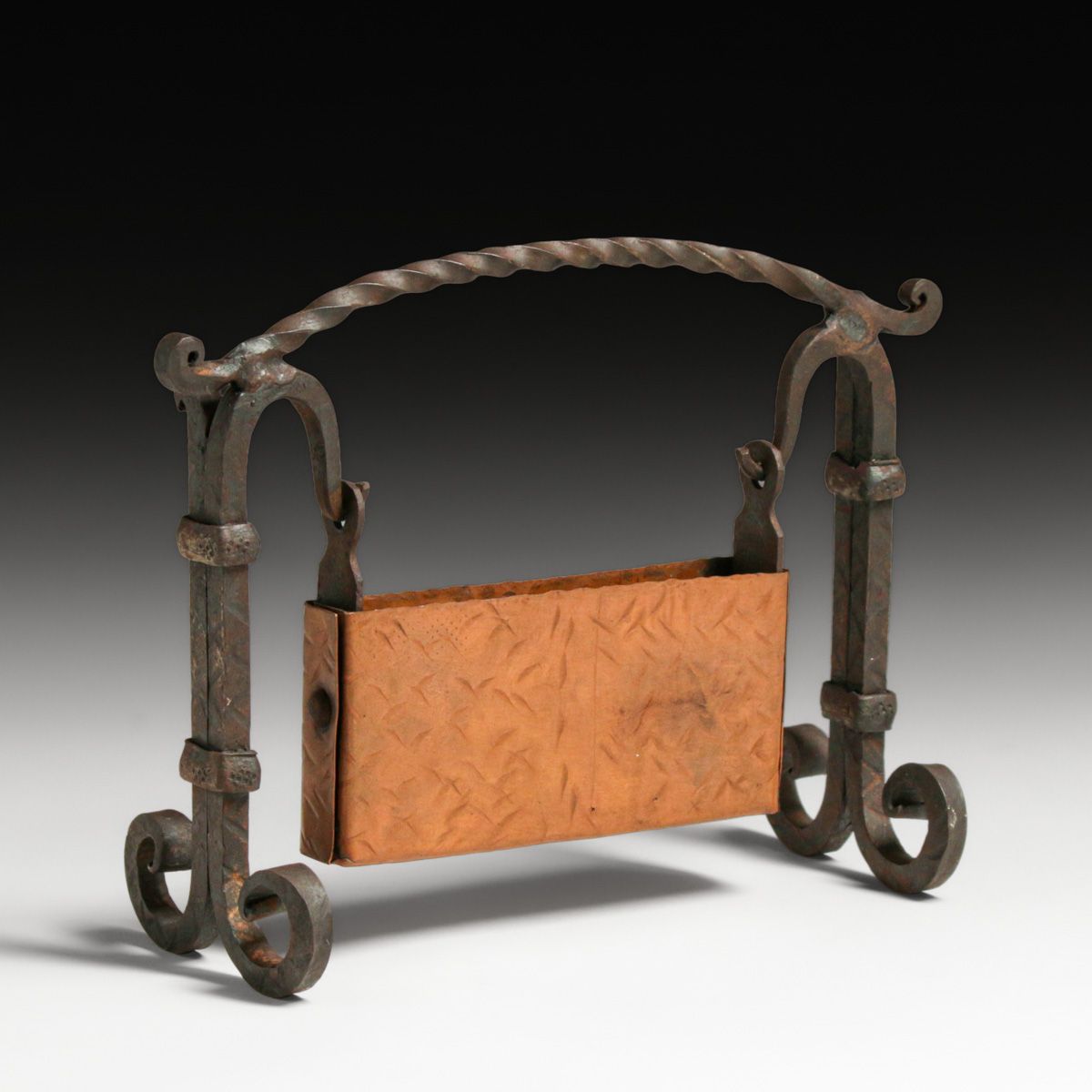 Arts & Crafts Period Hammered Copper & Hand Wrought Iron Card Holder c1920s. Unsigned. Copper partly polished. Wrought iron has excellent original patina. 7.5"w x 5.75"h x 3"d at feet