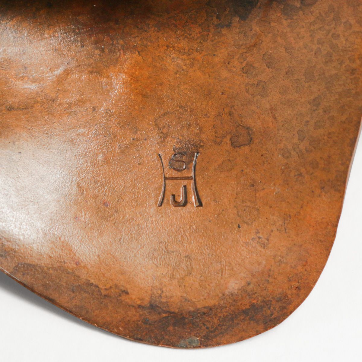 Arts & Crafts Period Hammered Copper Hanging Pocket Watch Holder c1910s. Similar to Fred Brosi's work but signed with an unknown "HSJ". Excellent new patina. 5.25"h x 4"w
