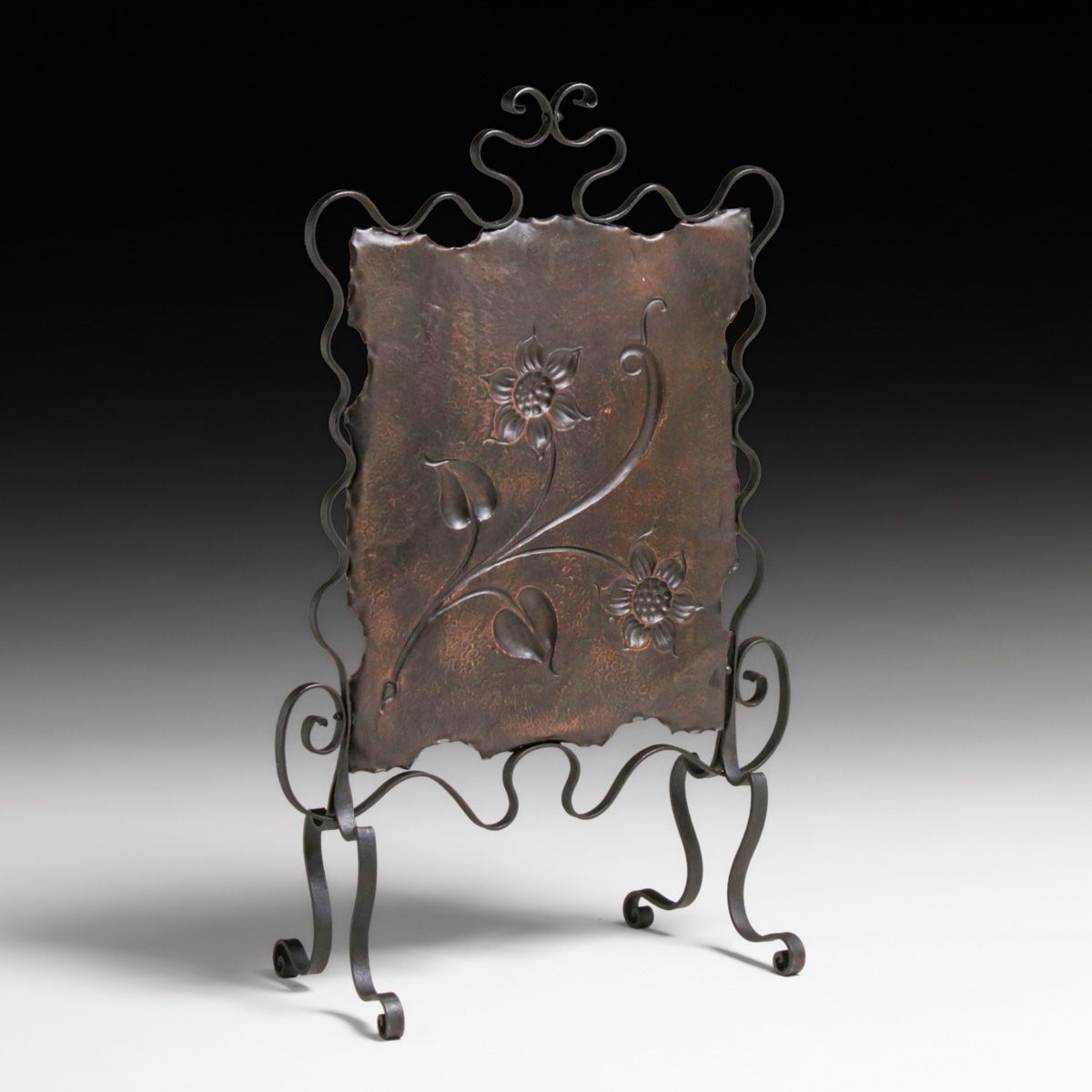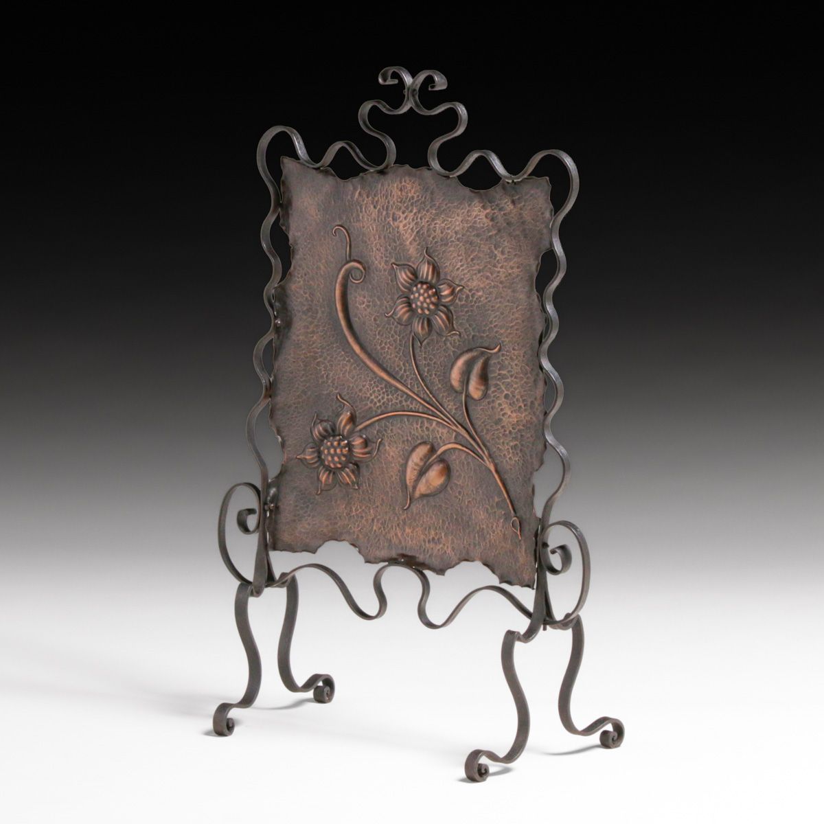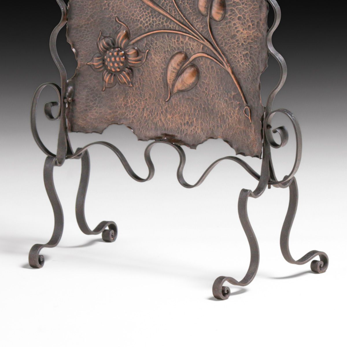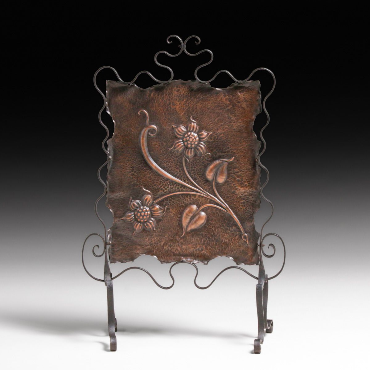 - English Arts & Crafts Hammered Copper & Iron Fire Screen c1900s