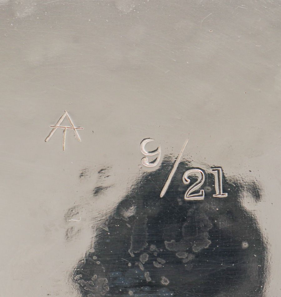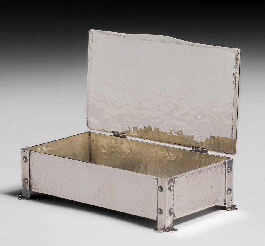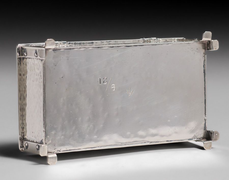 August Tiesselinck Hammered Copper Silver-Plated Strap-Hinge Box 1921. Tiesselinck was Dirk van Erp’s nephew. He came to America in 1911 to join his uncle Dirk. He only worked for himself for a brief 9 months in 1921 before going back to work for his uncle. Signed with “AT” mark and dated 9/21 for September 1921. Exhibited Bay Area Copper 1900-1950, Dirk van Erp & His Influence page 81, Figure 209. 6.75″w x 4″d x 1.75″h $5500