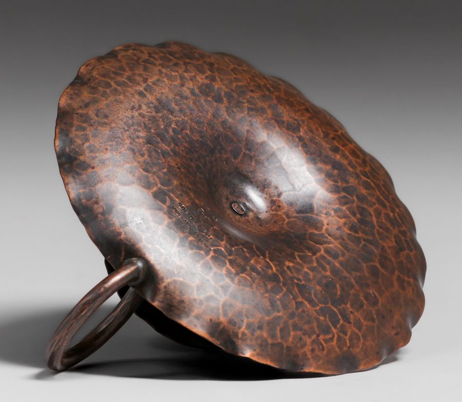 Arthur Cole – Avon Coppersmith Hammered Copper One-Loop Handle Candlestick c1930s. Cole worked for Roycroft until they closed and opened his own shop in Avon, NY. Signed. Excellent new patina. 6.75w x 2.25h inches SOLD