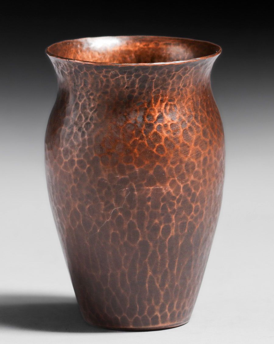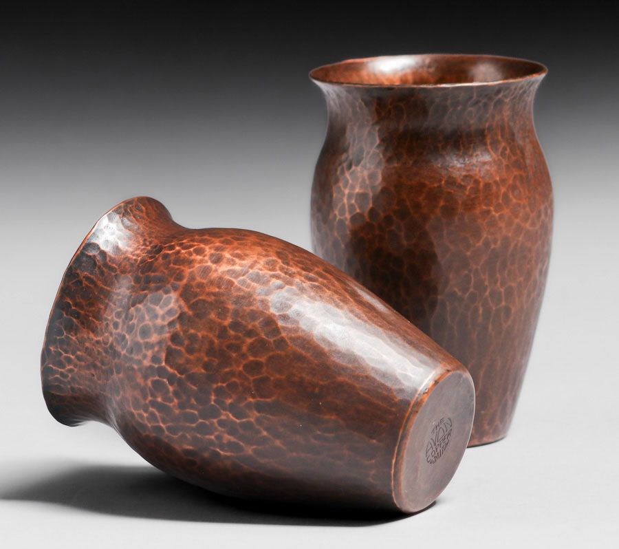 Arthur Cole – Avon Coppersmith Pair Hammered Copper Vases c1930s. Cole worked for Roycroft until they closed and opened his own shop in Avon, NY. Signed. Excellent new patina. 3”h x 2”d SOLD
