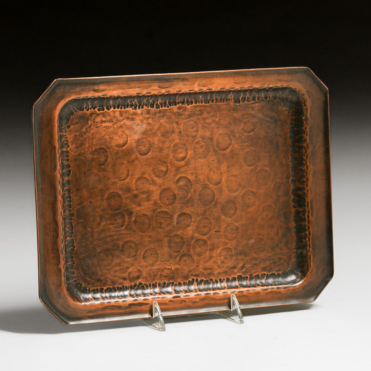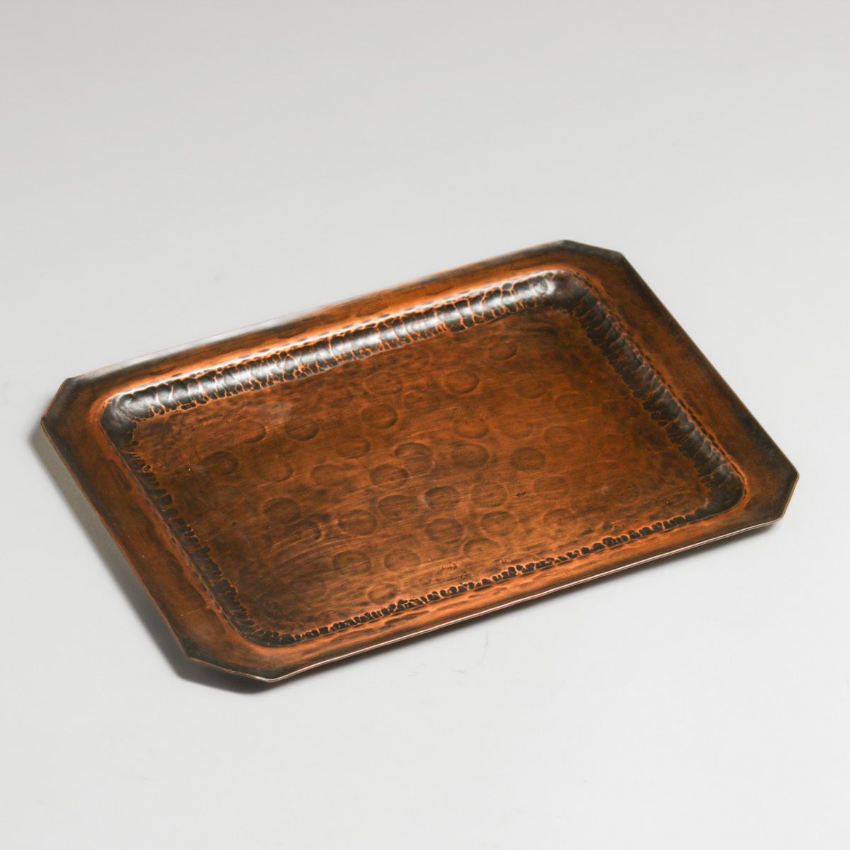 Avon Coppersmith - Arthur Cole Hammered Copper Tray c1930s. Arthur Cole was a former Roycrofter who opened up his own shop in Avon, NY after Roycroft closed about 1930. Signed. Excellent new patina. 9.75"l x 7.25"w