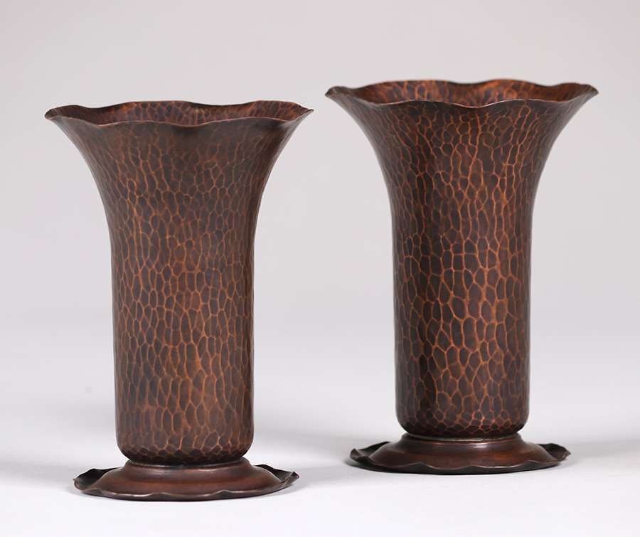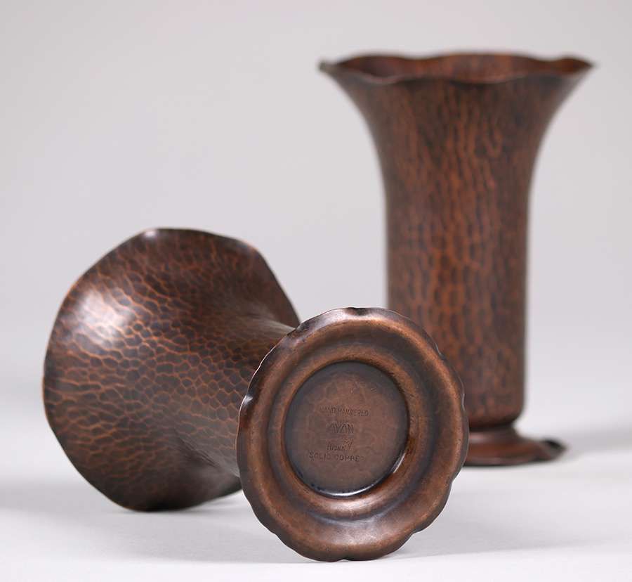 Pair of Arthur Cole hammered copper flared vases made at Avon Coppersmith -Avon, NY c1930s. Signed. Excellent new patina. 5.75"h x 4.25"d SOLD