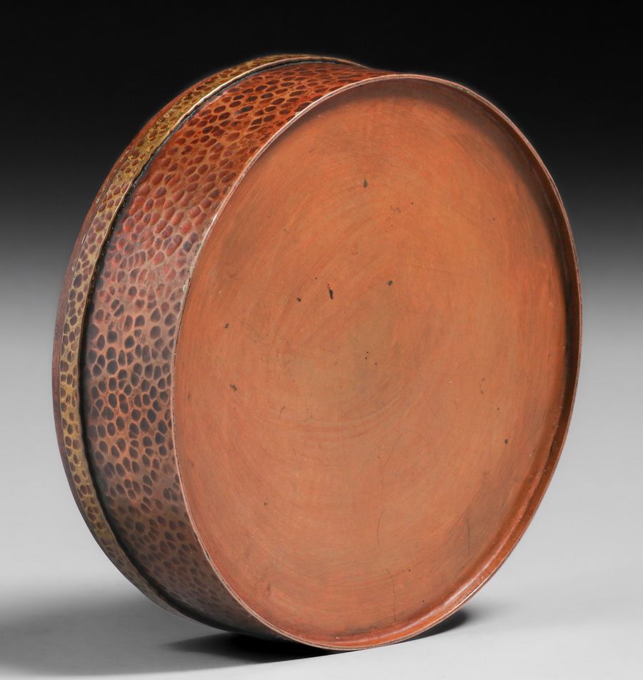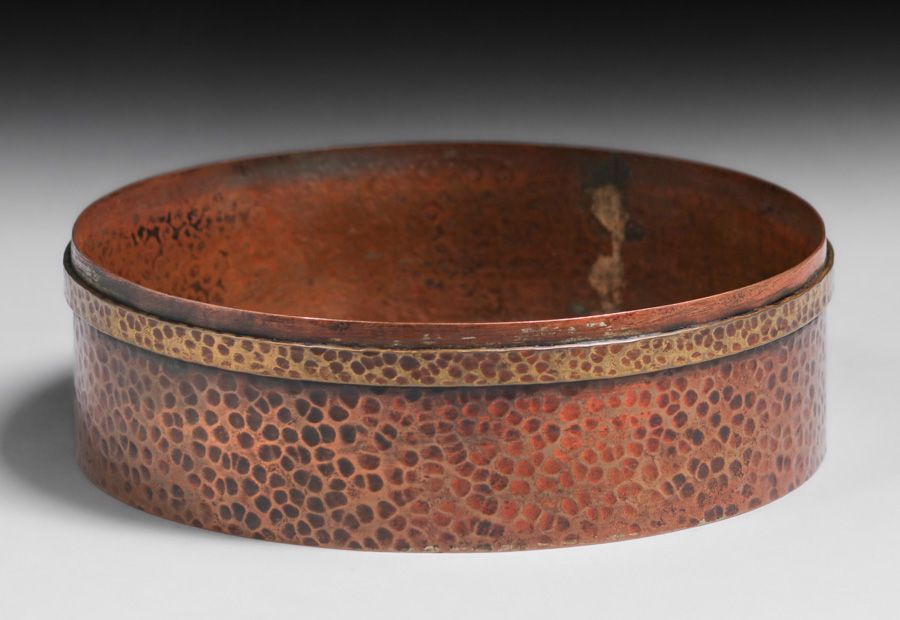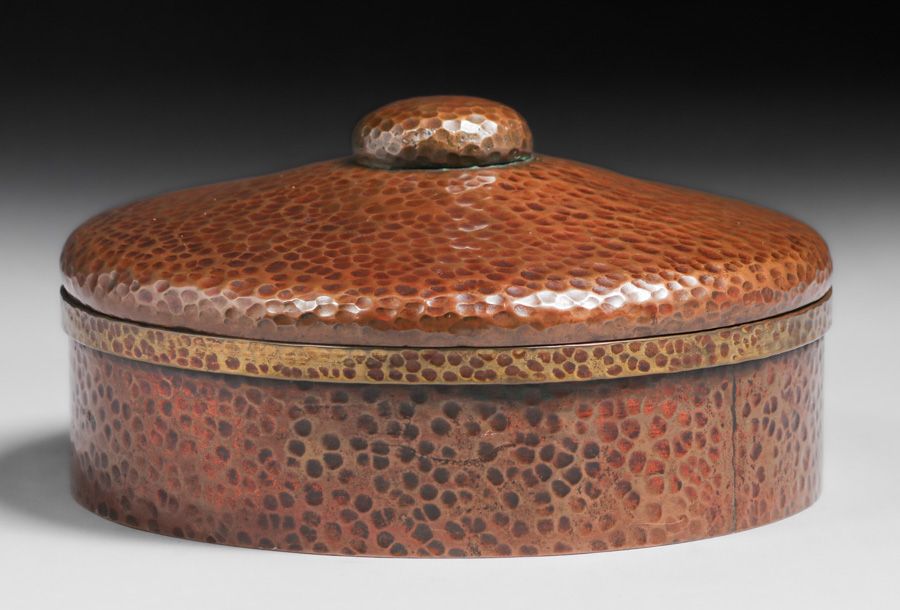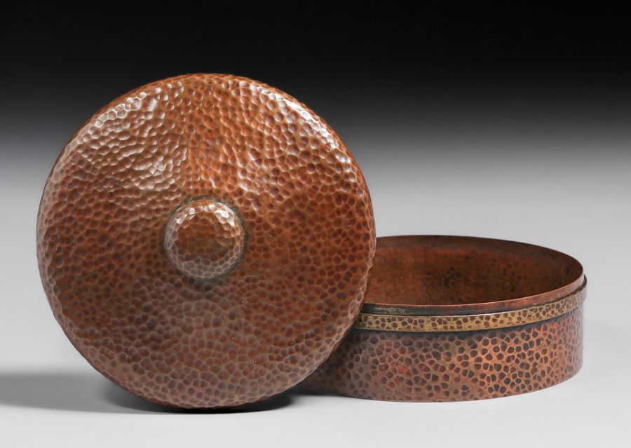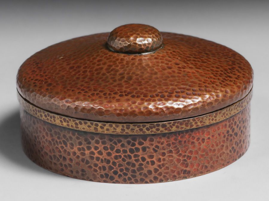 - Benedict Studios Hammered Copper & Brass Round Covered Box c1910