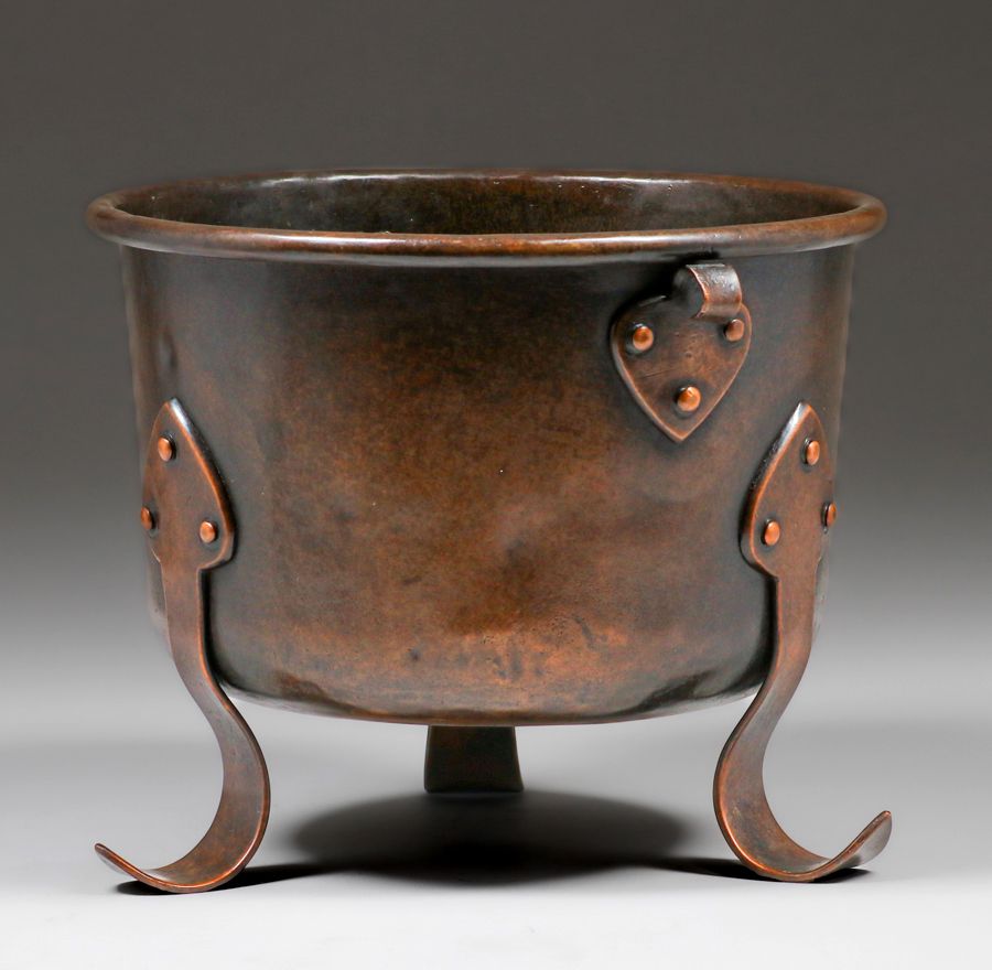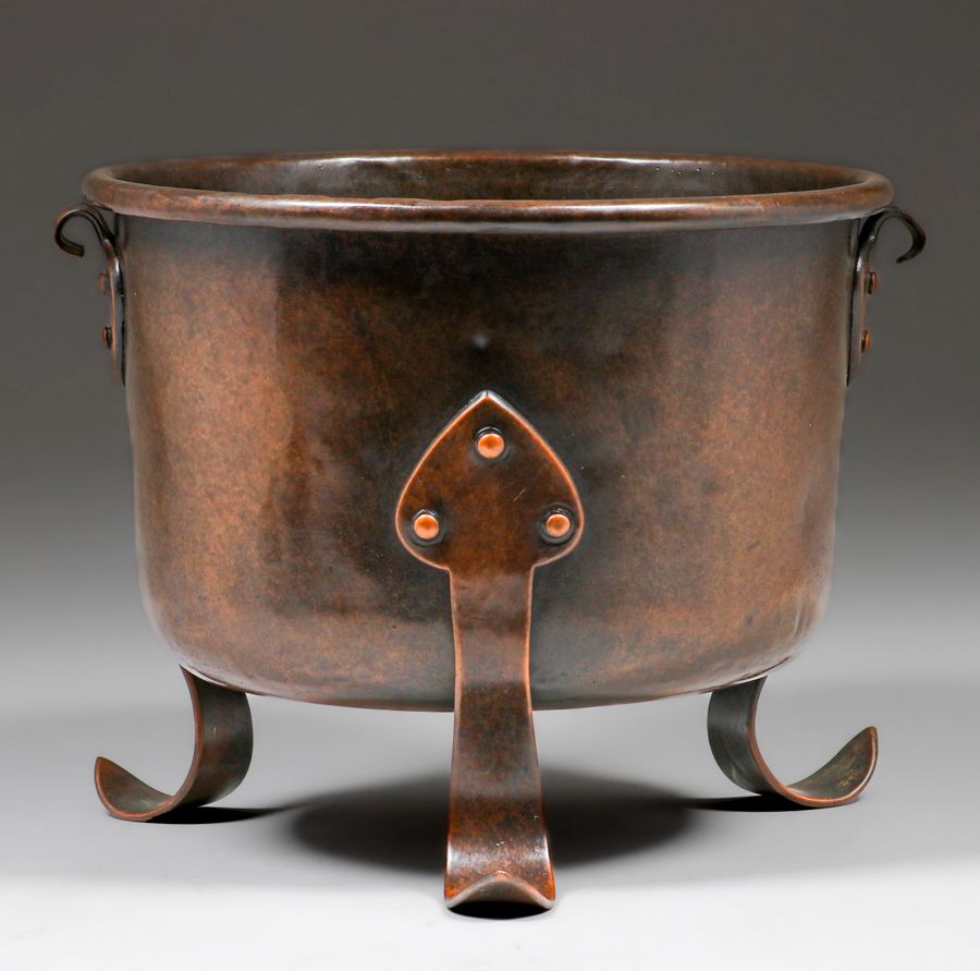 - Benedict Studios Hammered Copper Strap-Footed Jardiniere c1910