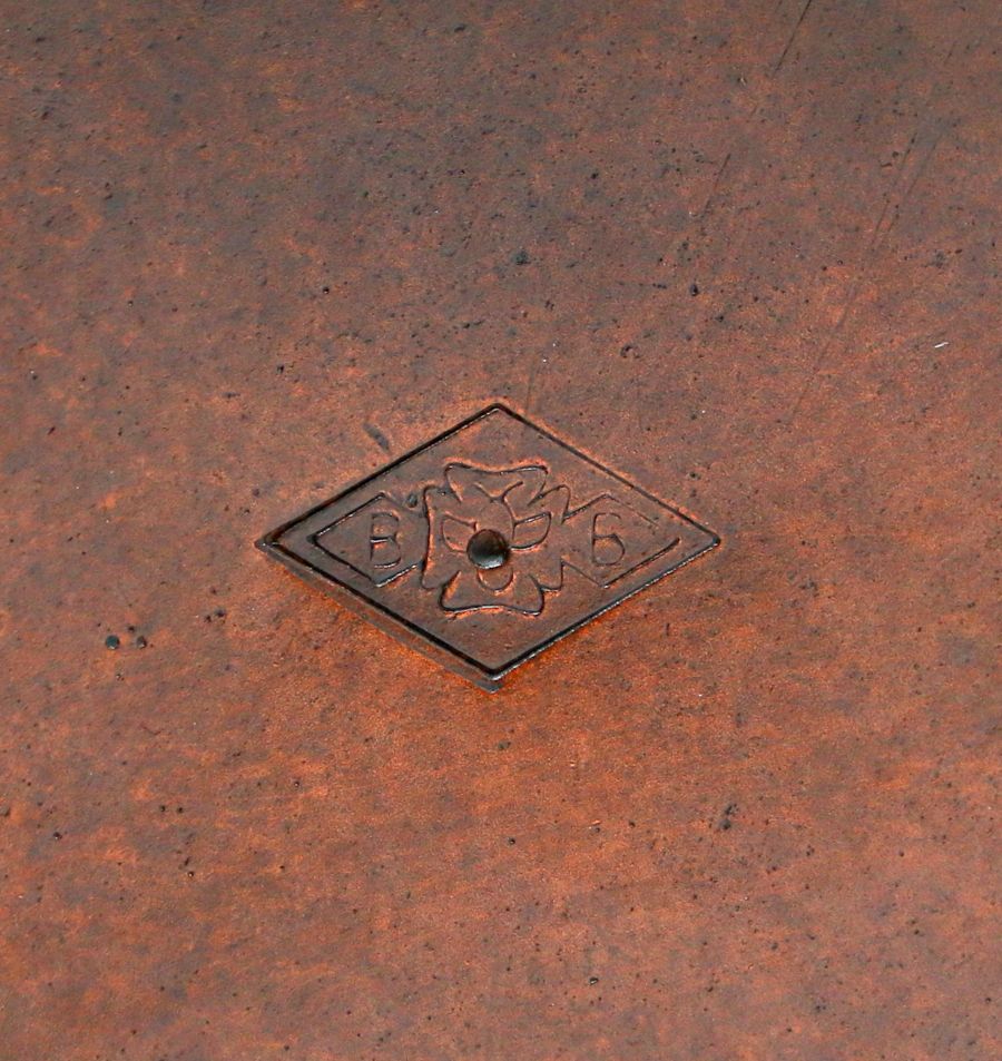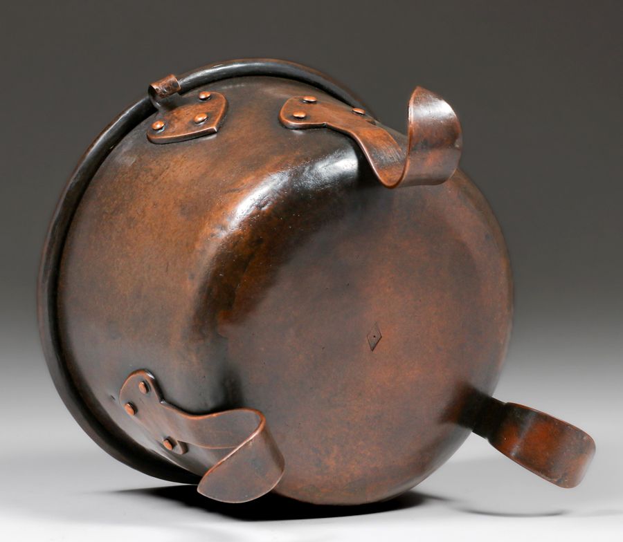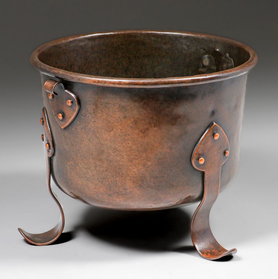 Benedict Studios Hammered Copper Strap-Footed Jardiniere c1910. Signed. Excellent new patina. 8.3/8"h x 10"d SOLD