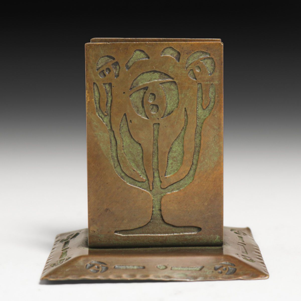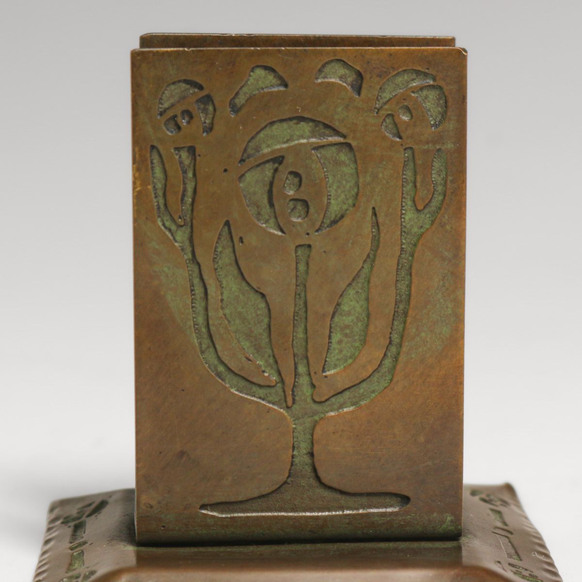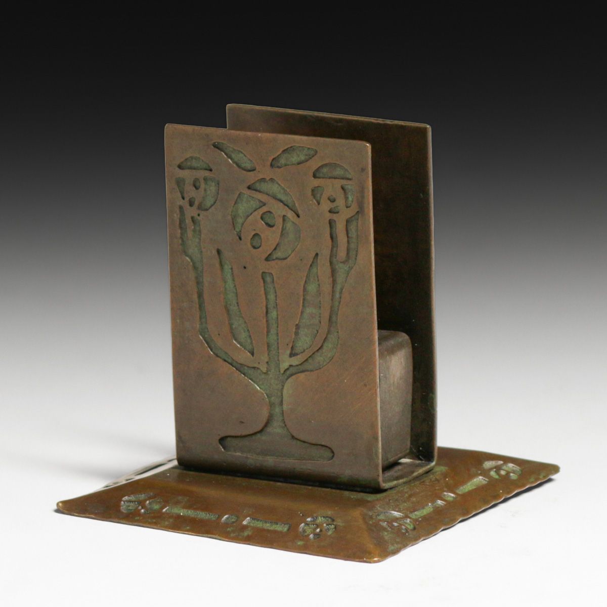 Carence Crafters Acid-Etched Matchbox Holder c1910. Unsigned. Excellent new patina. 2.76”h x 2.5”w x 2.5”d