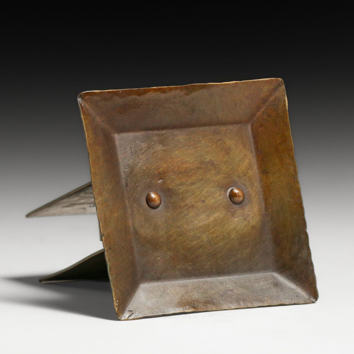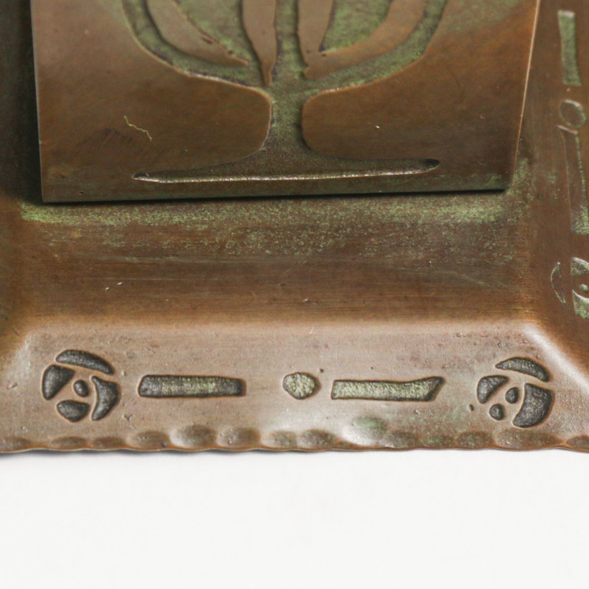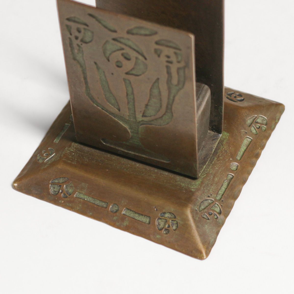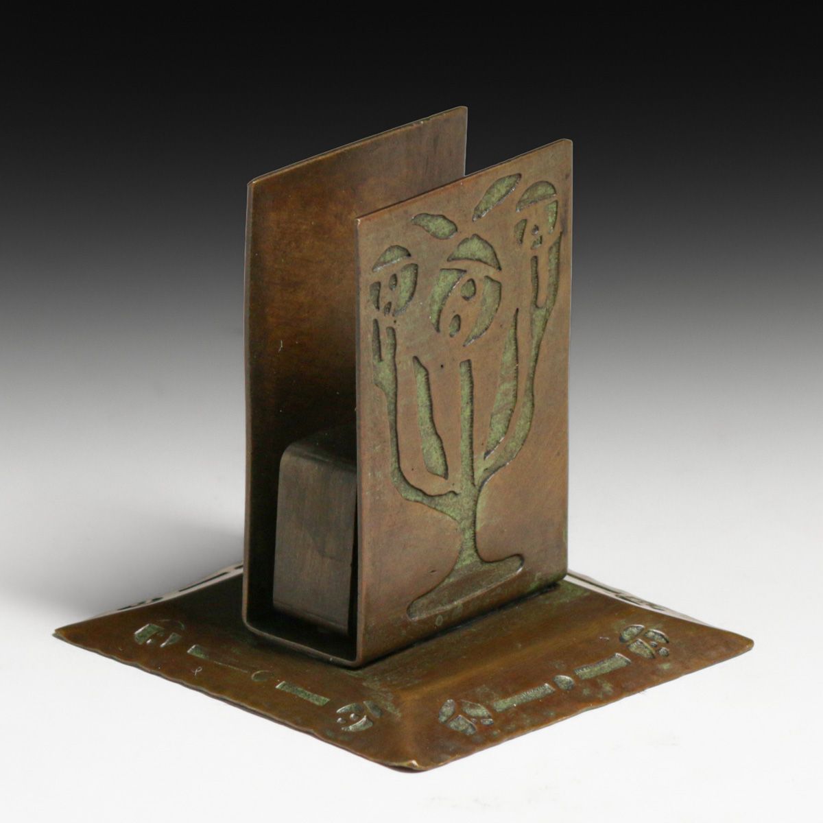 Carence Crafters Acid-Etched Matchbox Holder c1910. Unsigned. Excellent new patina. 2.76”h x 2.5”w x 2.5”d
