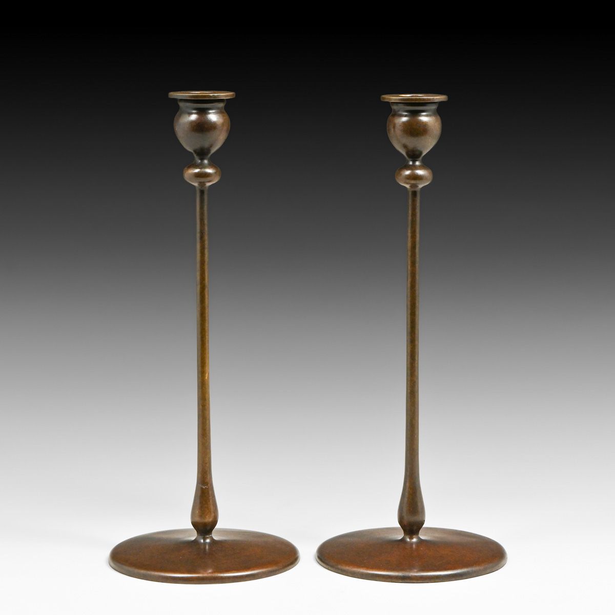 Chicago Prairie School Delta Candlesticks c1910. Appear to be exactly like Jarvie's Delta form but unsigned. Excellent new patina. 15"h x 6"d