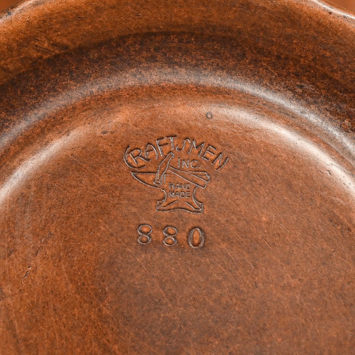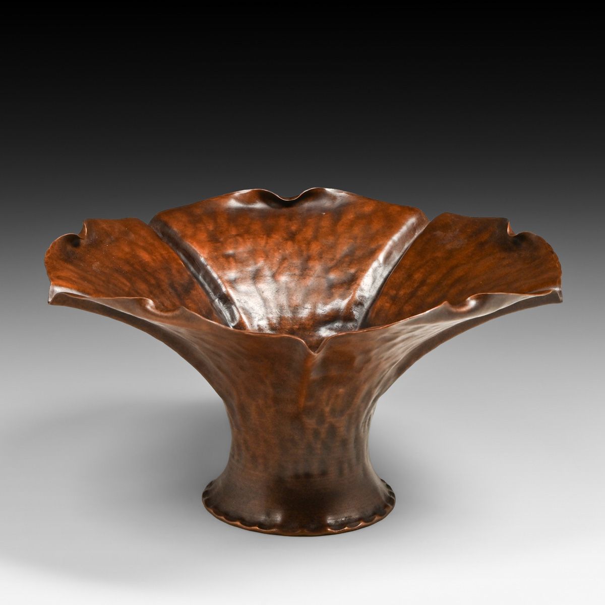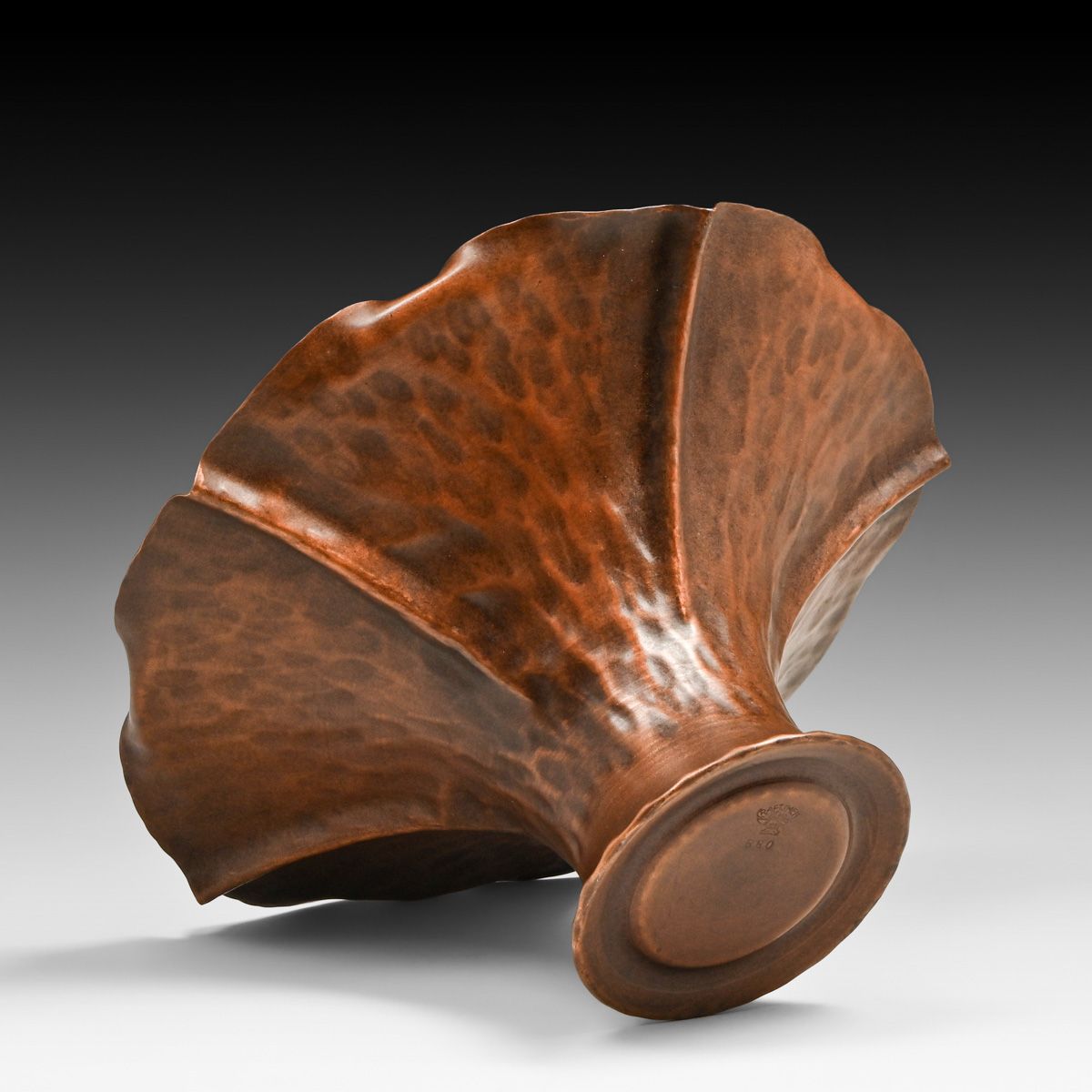 Craftsman Studios - Laguna Beach, CA #880 Hammered Copper Flared Vase c1930s. Signed. Excellent new patina. 9.75"d x 5.5"h
