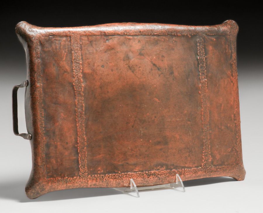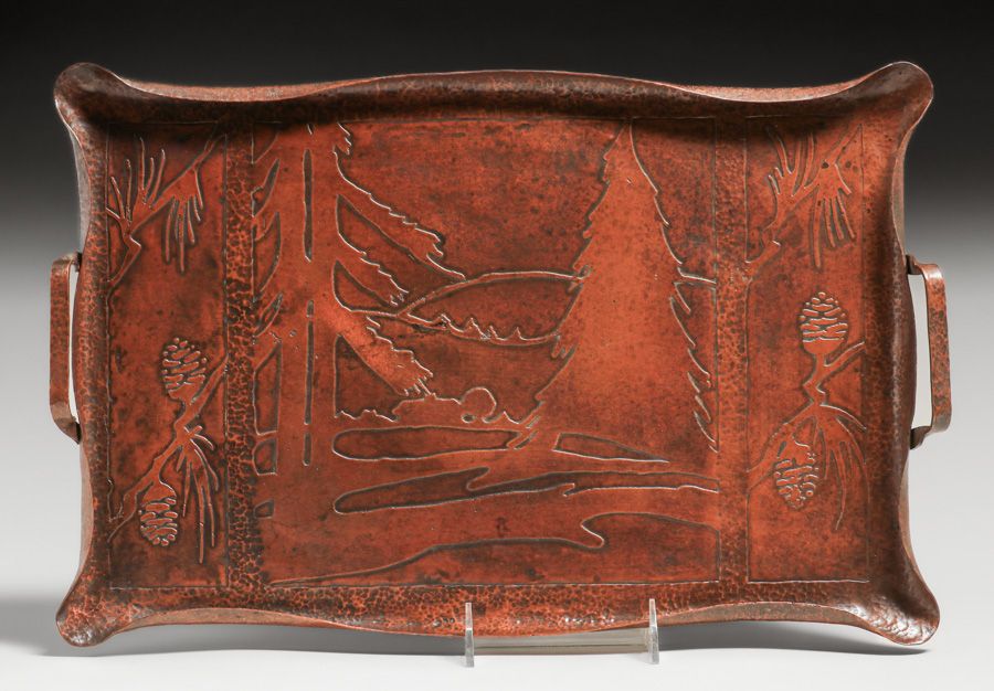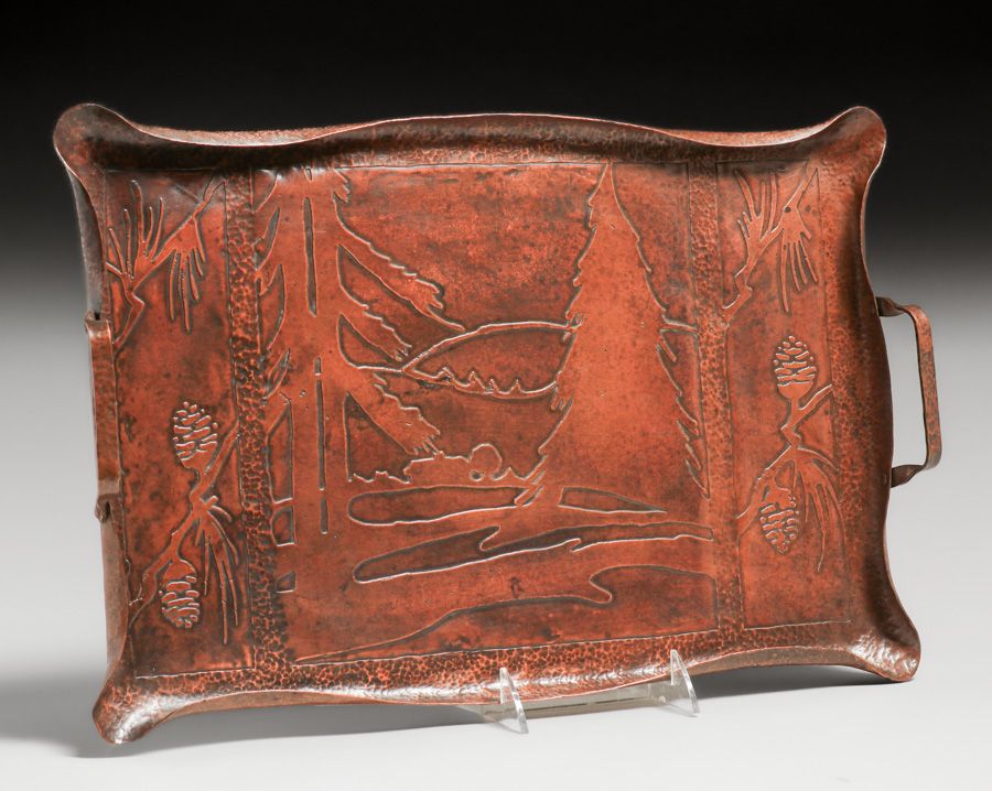 Early Craftsman Studios - Brooklyn Hammered Copper Acid-Etched Pine Tree Scenic Two-Handled Tray c1917-1920. Unsigned. Excellent new patina. 17 7/8"w x 11 7/8" SOLD