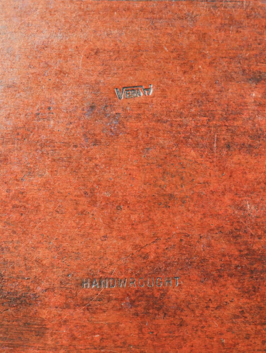 Agatha van Erp Student Hammered Copper & Enamel Box c1950s. Signed "Vera" and what appears to be the Dirk van Erp studio's HANDWROUGHT stamp. Excellent new patina. 4 1/8"w x 3"d x 1.25"h $950
