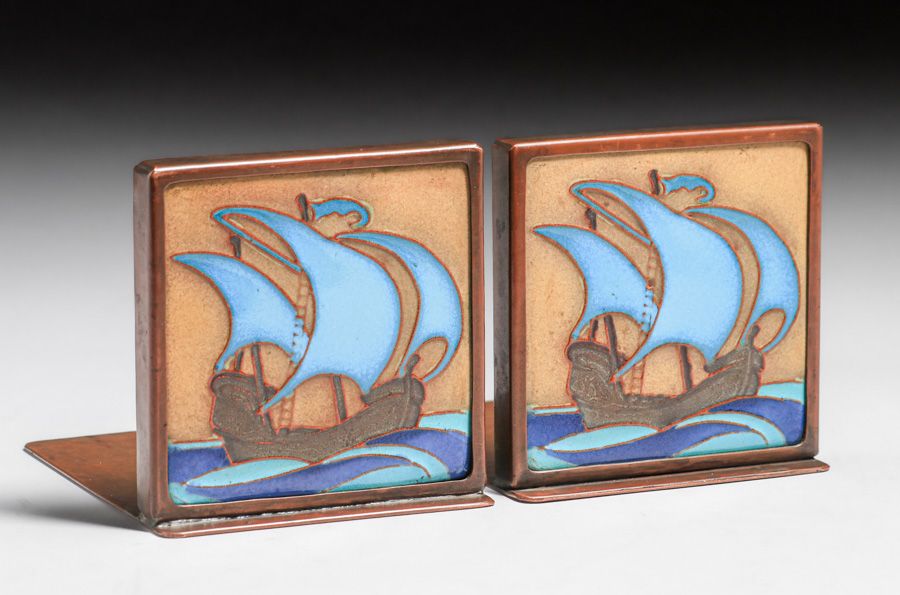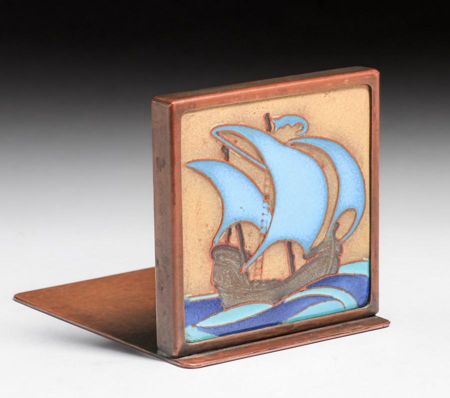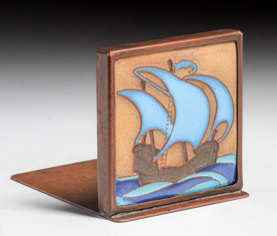 - Dirk van Erp - California Faience Hammered Copper Galleon Ship Tile Bookends c1915-1920