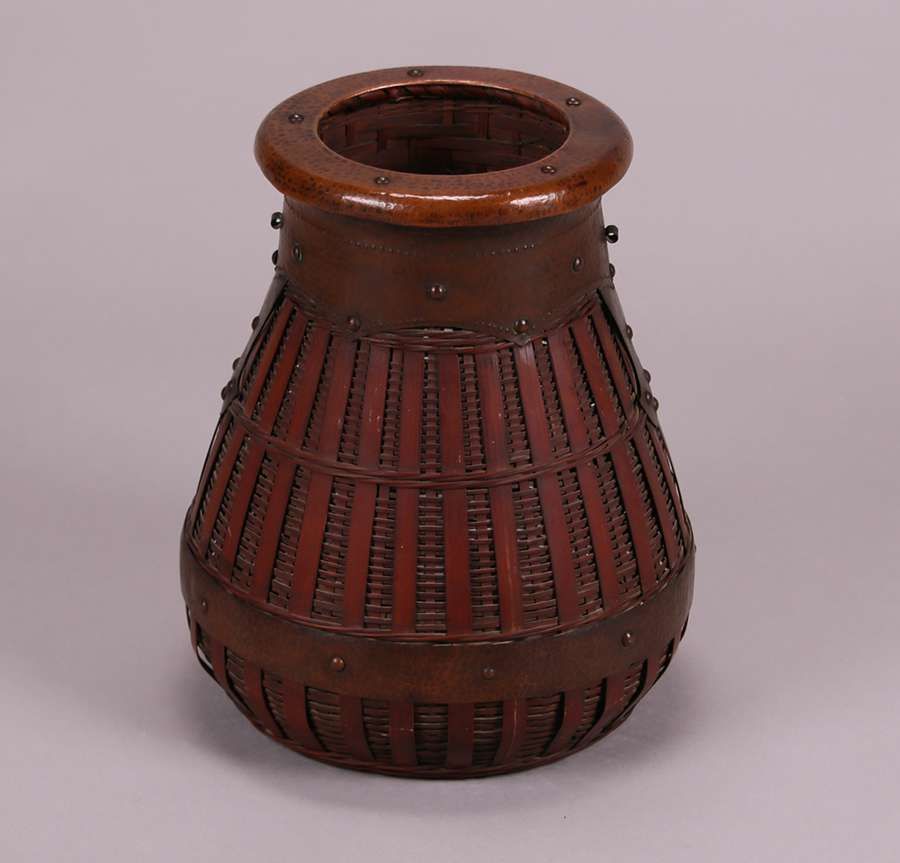 Dirk van Erp hammered copper trim and straps riveted to a Japanese or Chinese basket c1910-1920. Unsigned. Enhanced original patina. 13.5"h x 10"d SOLD