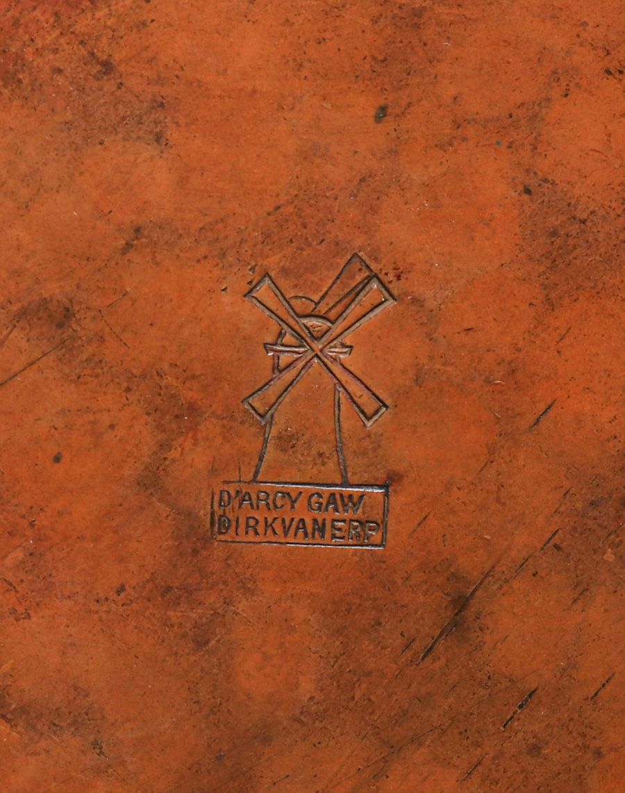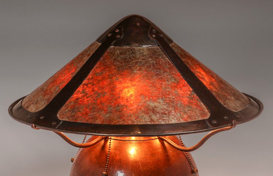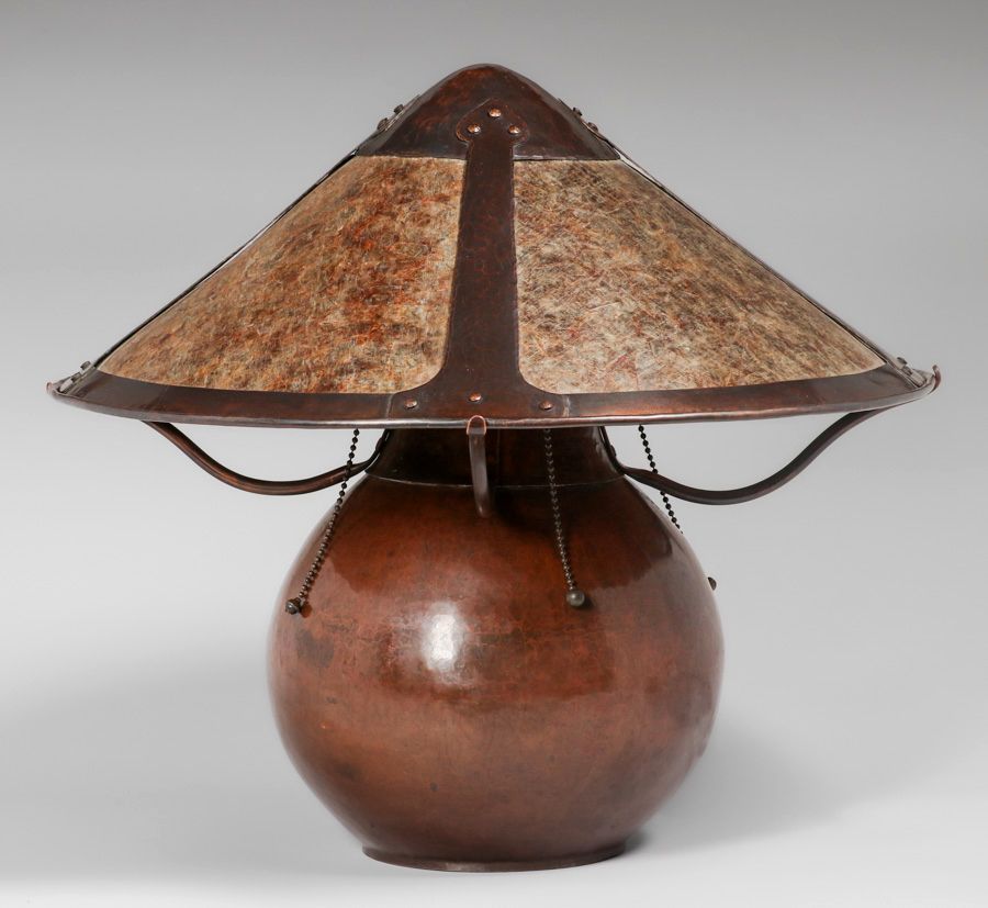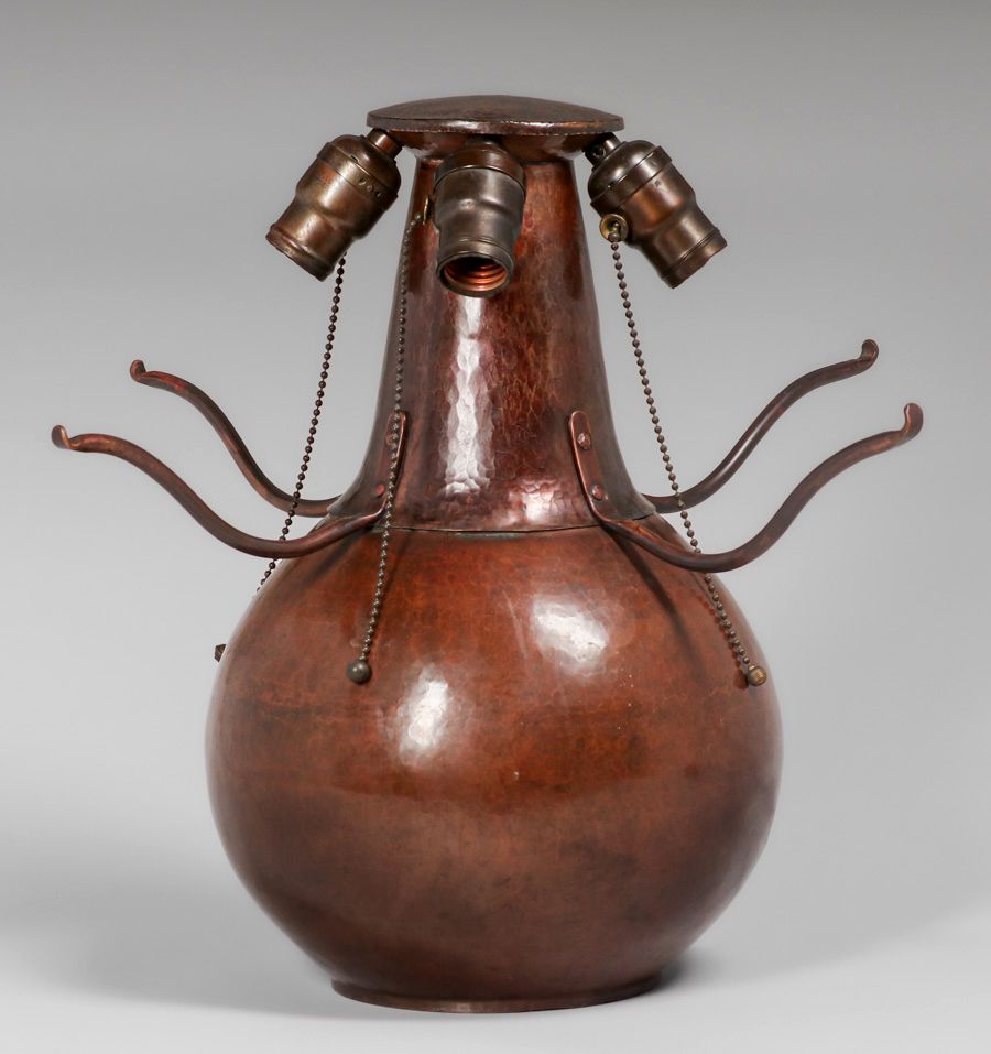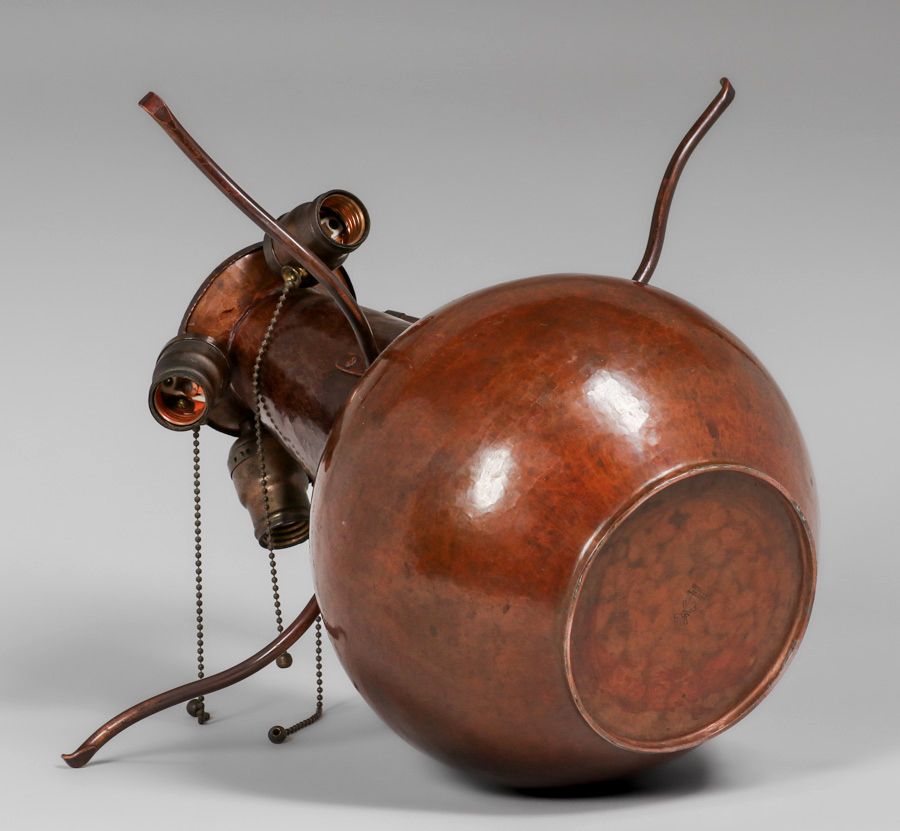 Dirk van Erp - D'Arcy Gaw Hammered Copper Bulbous Lamp c1910. Signed. The upper portion of the lamp including the arms and shade were made by William van Erp in 1974. The bulbous portion of the base was made by Dirk van Erp c1910 and has an excellent original patina. Exhibited Bay Area Copper 1900-1950, Dirk van Erp & His Influence 2012, page 16, figure 31. 18"h x 19"d SOLD