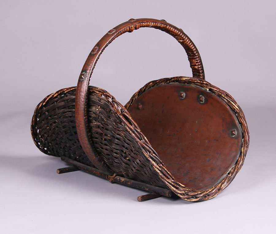 Large Dirk van Erp wicker log basket with hammered copper liner and warty handle. Unsigned. Excellent original patina. Originally sold for $20 c1915. 20"h x 21"w x 26"d SOLD