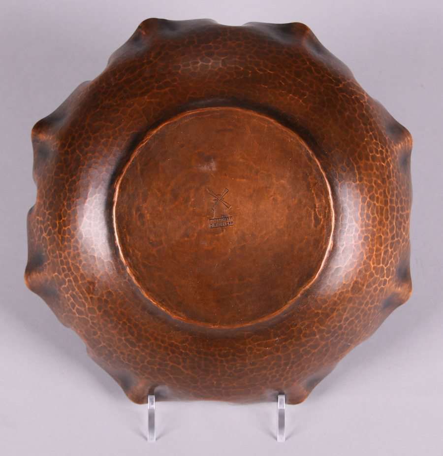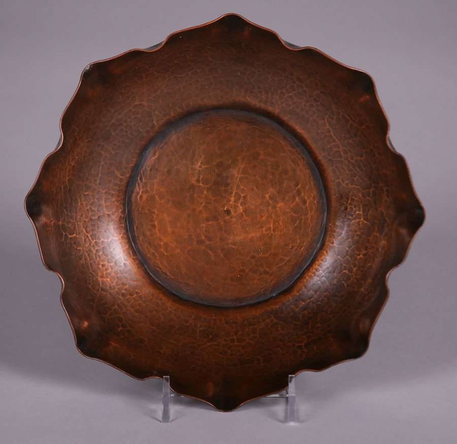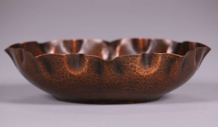 Dirk van Erp hammered copper floral-form scalloped bowl. Open-box, San Francisco mark. Excellent new patina. Exquisitely crafted. 8″d SOLD