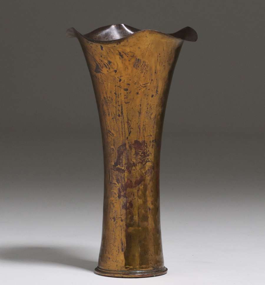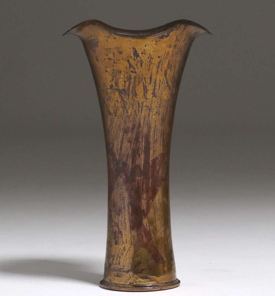 Dirk van Erp Hammered Brass Flared Shell Casing Vase c1902-1908. Marked Winchester 8-98. Exhibited in Bay Area Copper 1900-1950, Dirk van Erp & His Influence page 5, figure 2. Original patina. 10"h x 5.5"d SOLD