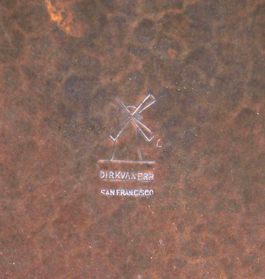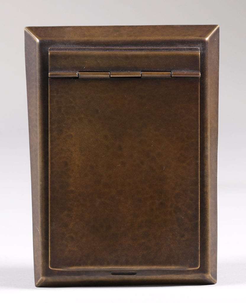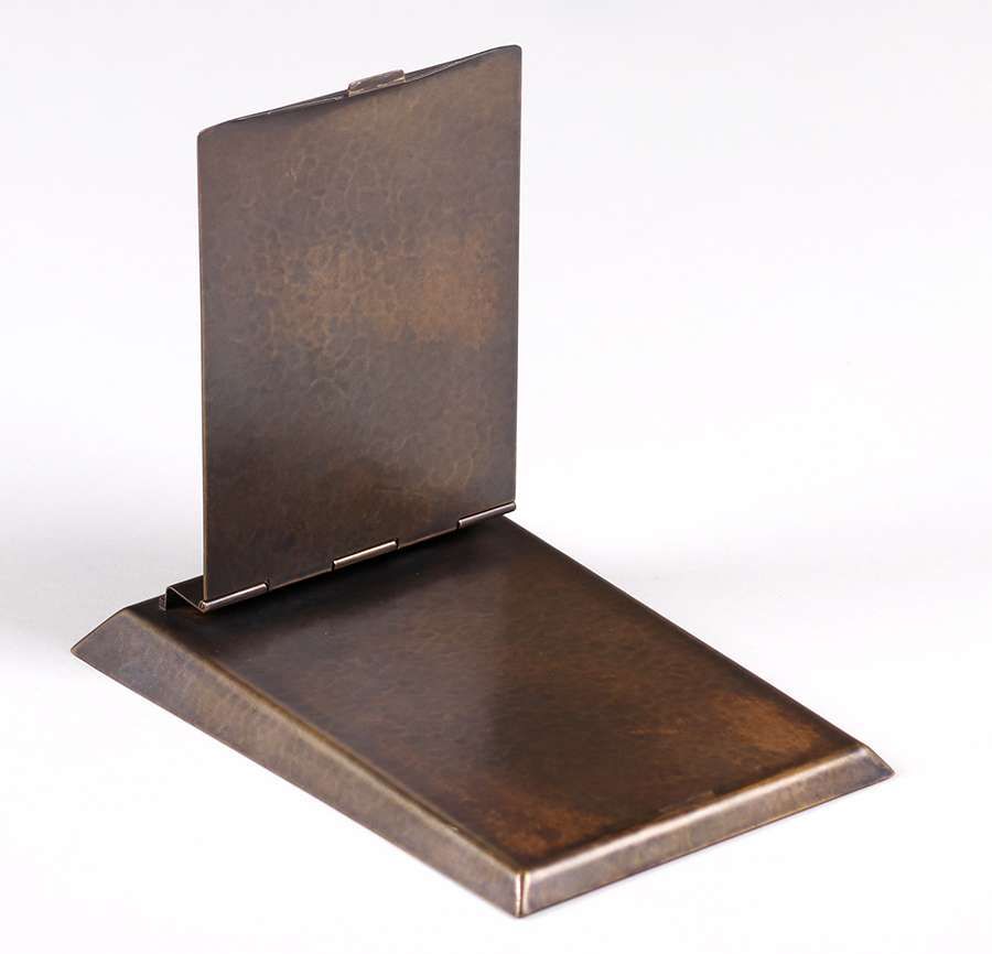 Dirk van Erp hammered brass paper pad holder. Signed with open-box, San Francisco mark. Excellent new patina. 7 3/8″ x 5.5″w SOLD