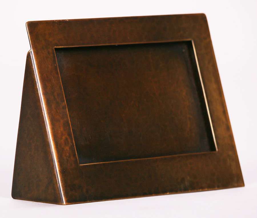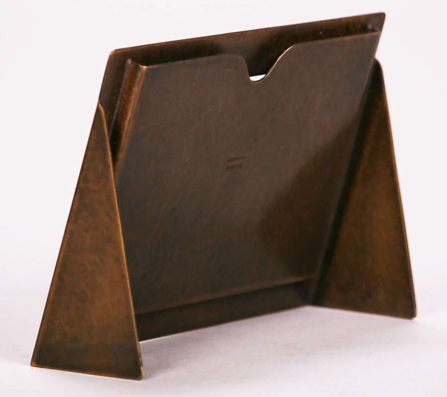 Dirk van Erp hammered brass picture frame (original a desk calendar frame). Signed with miniature Dirk van Erp windmill. Excellent new patina. 5"h x 6.5"w x 2"d SOLD