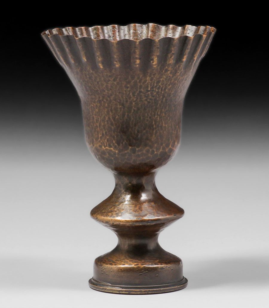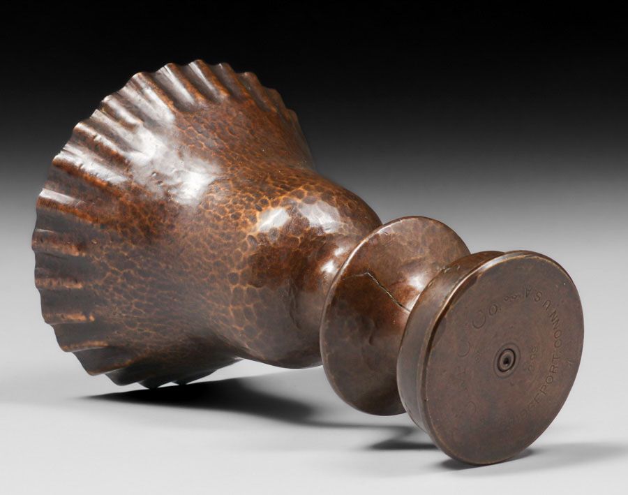 Dirk van Erp Hammered Brass Shell Casing c190-1908. Signed with the “UMC Co” munitions mark and the manufacture date “2-99”. Excellent new patina. 7.5″h x 5″d SOLD