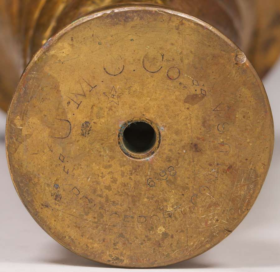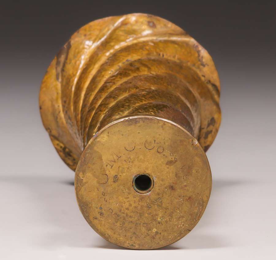 Dirk van Erp Hammered Brass Shell Casing Vase c1902-1908. Extraordinary spiral hammering. Original brass patina. Marked UMC Co 6-98. 9"h x 4.5"d SOLD
