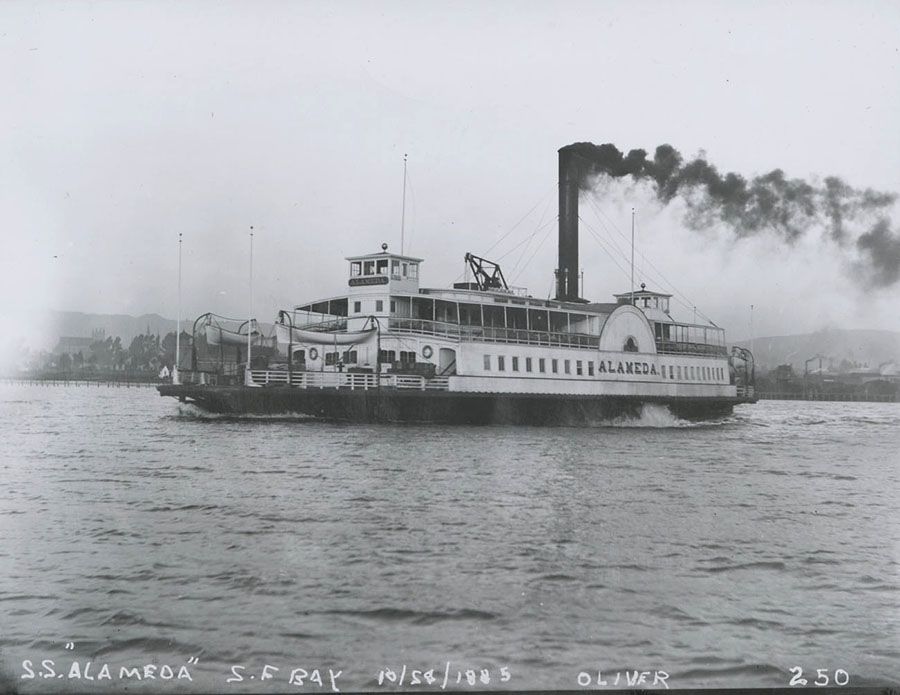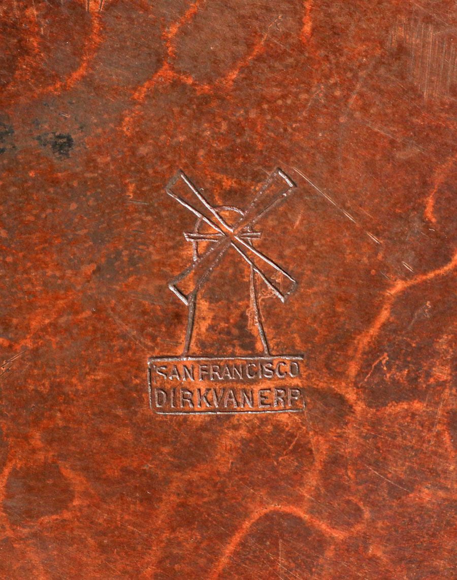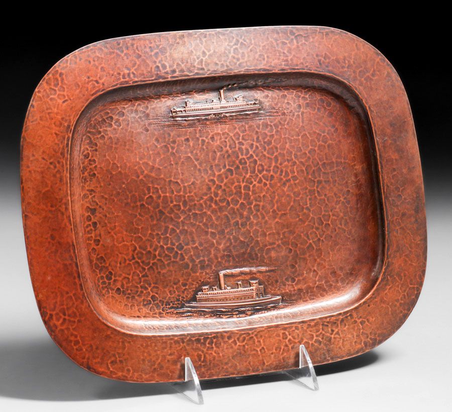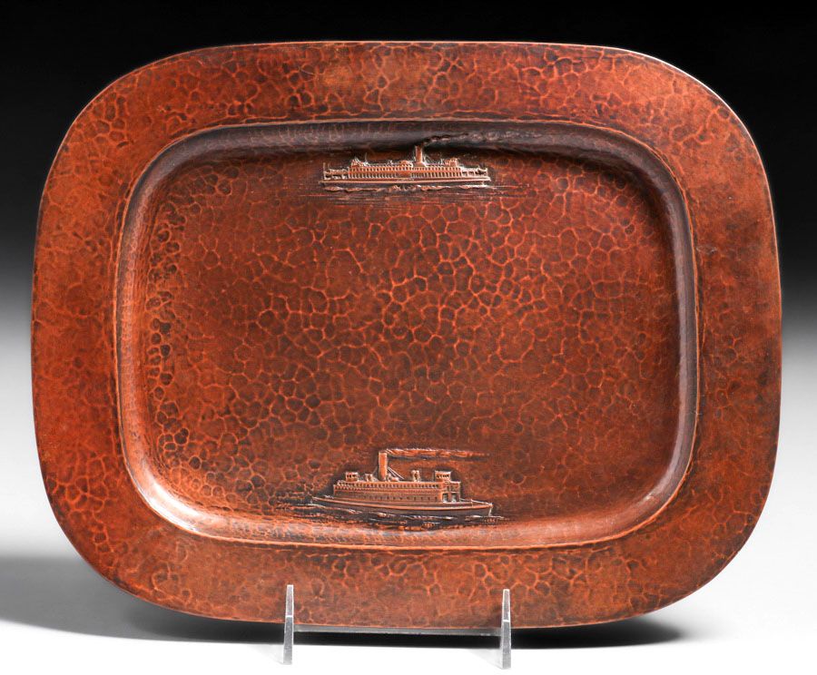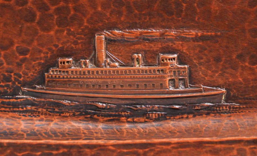 Dirk van Erp - August Tiesselinck Hammered Copper Commemorative San Francisco Bay Steamship Tray c1922-1926. Incredible detail of SS Alameda and SS Golden Gate. Tiesselinck returned to work for his Uncle Dirk in 1922 and continued there until taking a job as Metal Shop Teacher at San Francisco's Mission High School. Signed with open-box, San Francisco mark. Excellent new patina. 13" x 10" SOLD