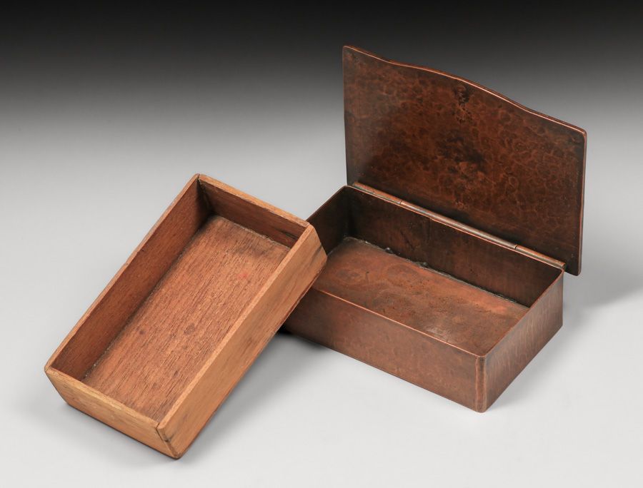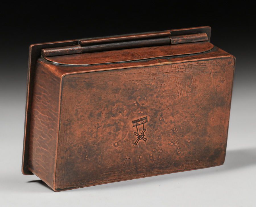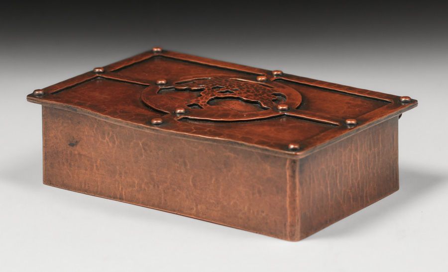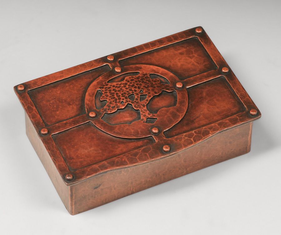 - Dirk van Erp Hammered Copper Cutout & Riveted Oak Tree Box c1913-1914