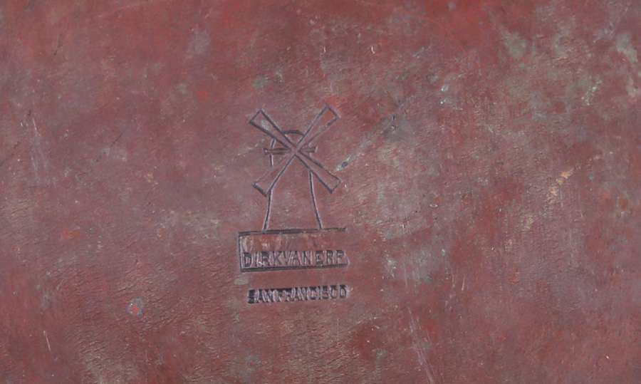 Beautiful Dirk van Erp hammered copper flared bowl c1915-1920. Excellent original patina. Open-box, San Francisco mark. 6"h x 12.75"d SOLD
