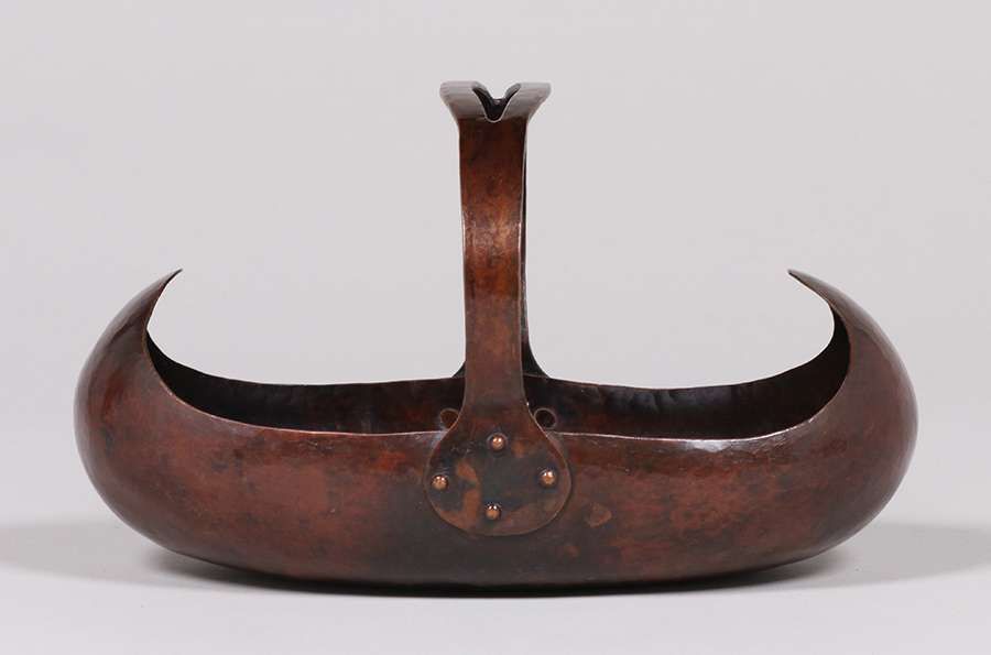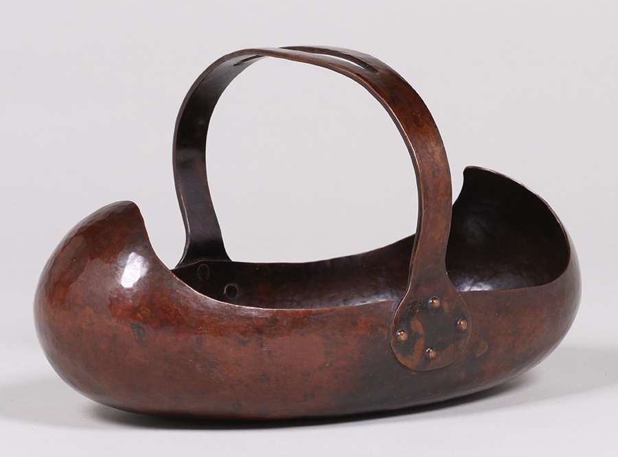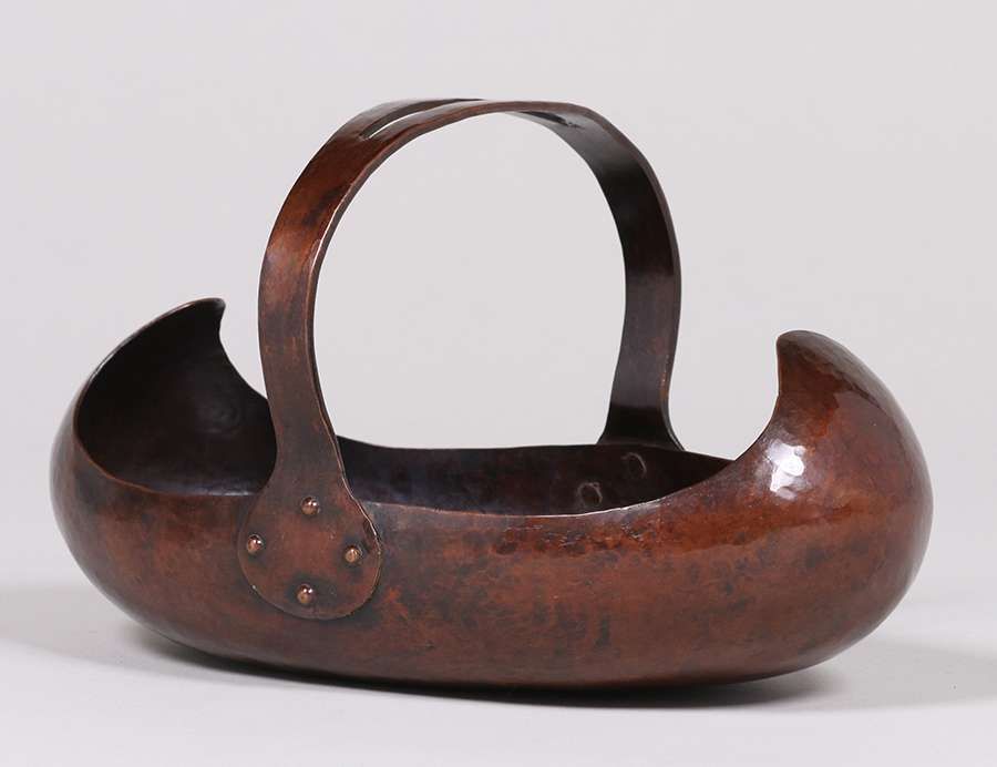 Dirk van Erp hammered copper Dutch-Shoe shaped one-handled flower basket with unusual cutout handle c1913-1914. Signed with open-box, San Francisco mark. Excellent original patina. 6.25"h x 11"w x 6.5"d SOLD