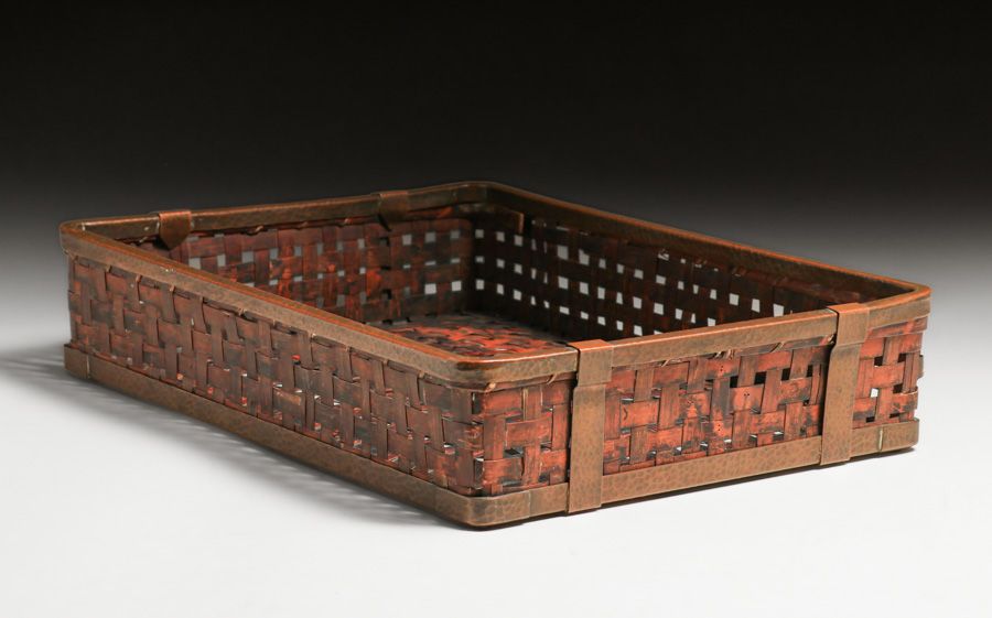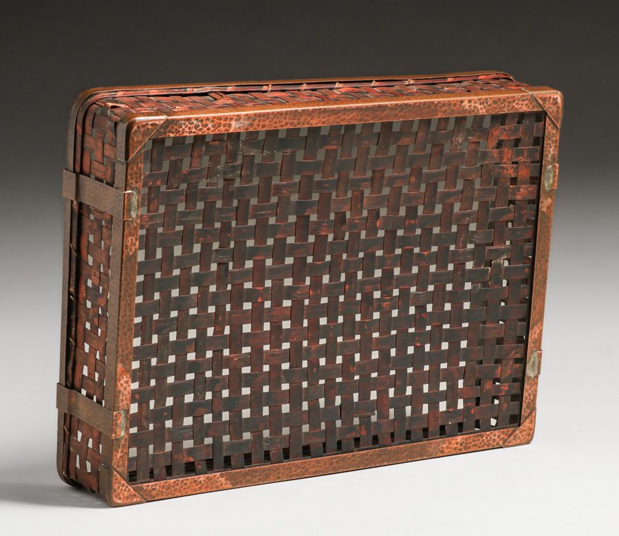 Dirk van Erp Hammered Copper & Japanese Hand-Woven Bamboo Basket c1917-1920 . Van Erp started offering these baskets during WWI as copper became scarce. Unsigned. Excellent original patina. 15" x 11.5" x 3"h
