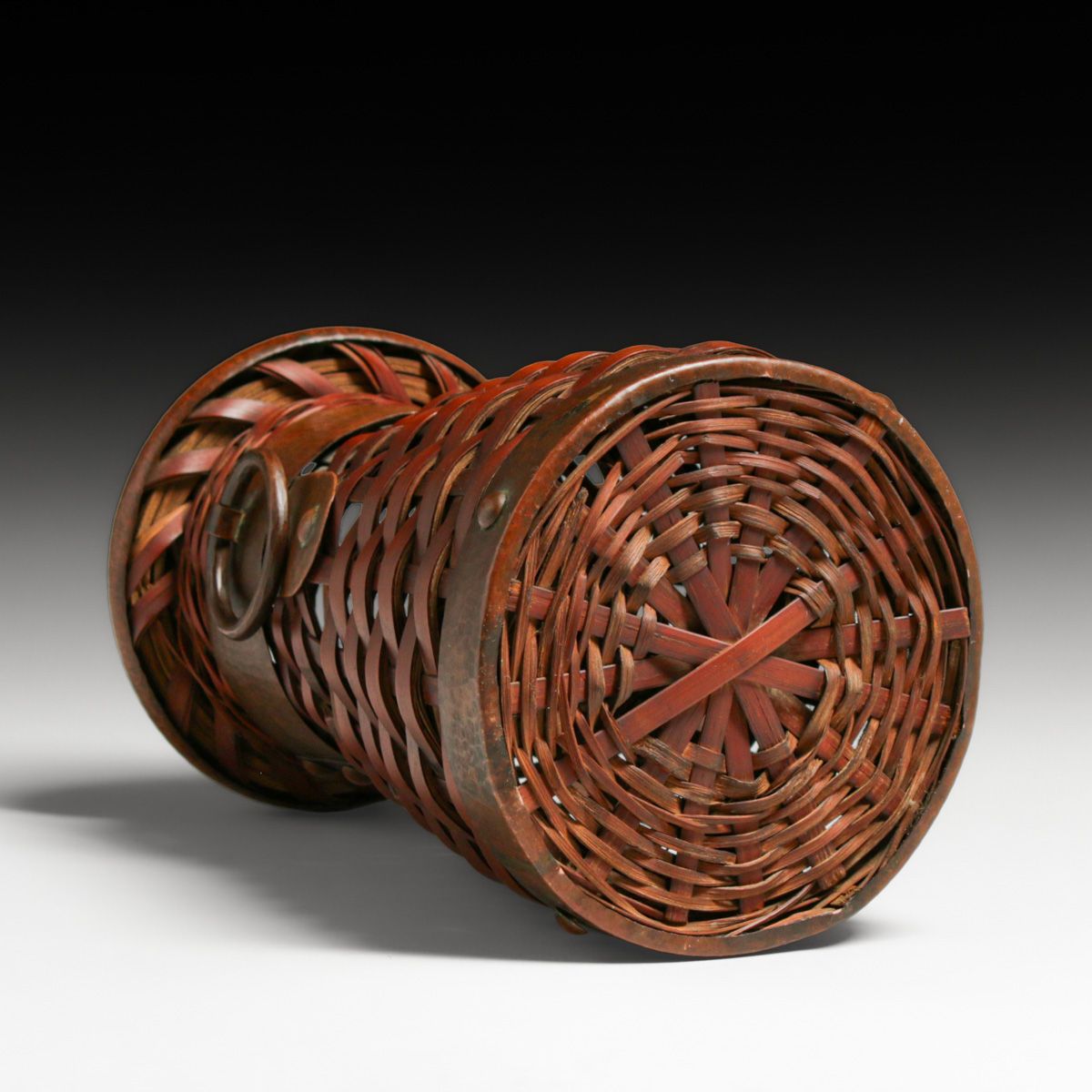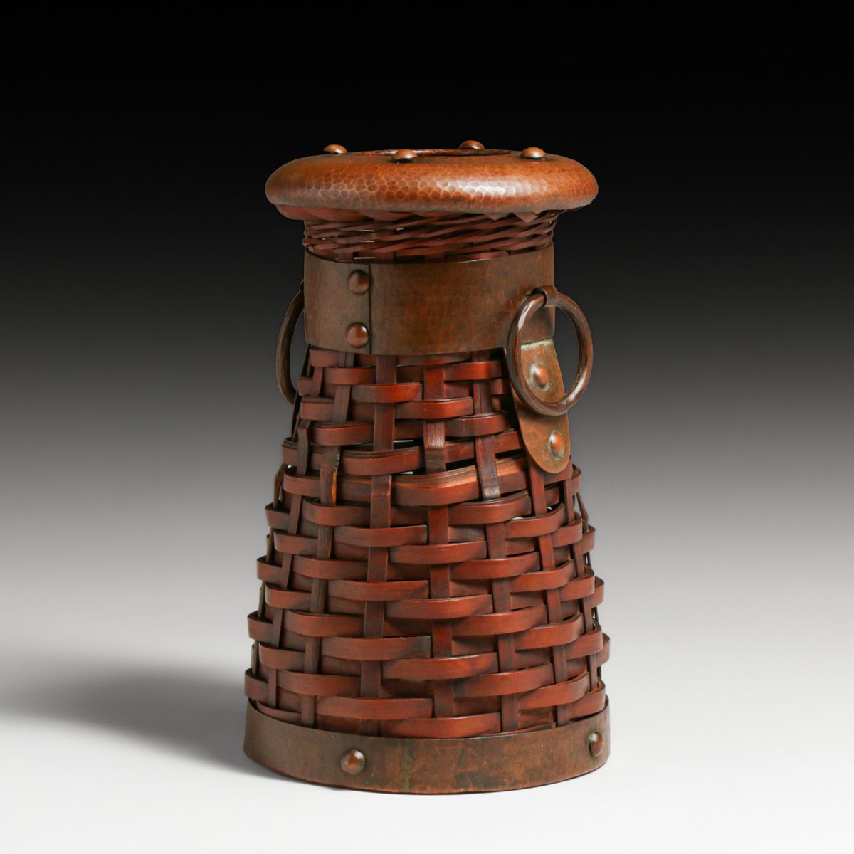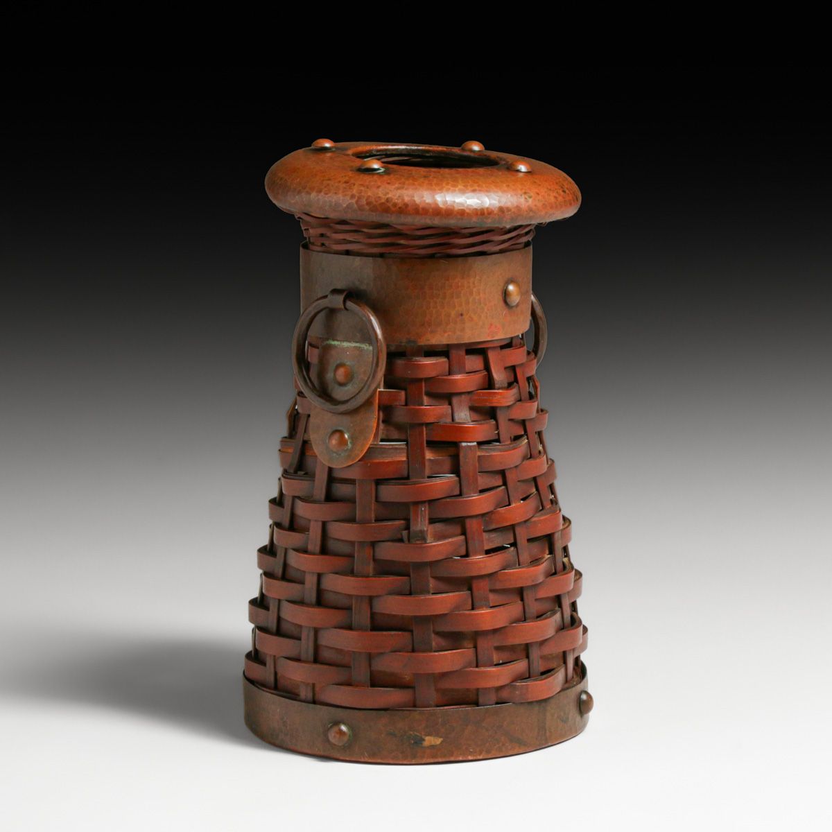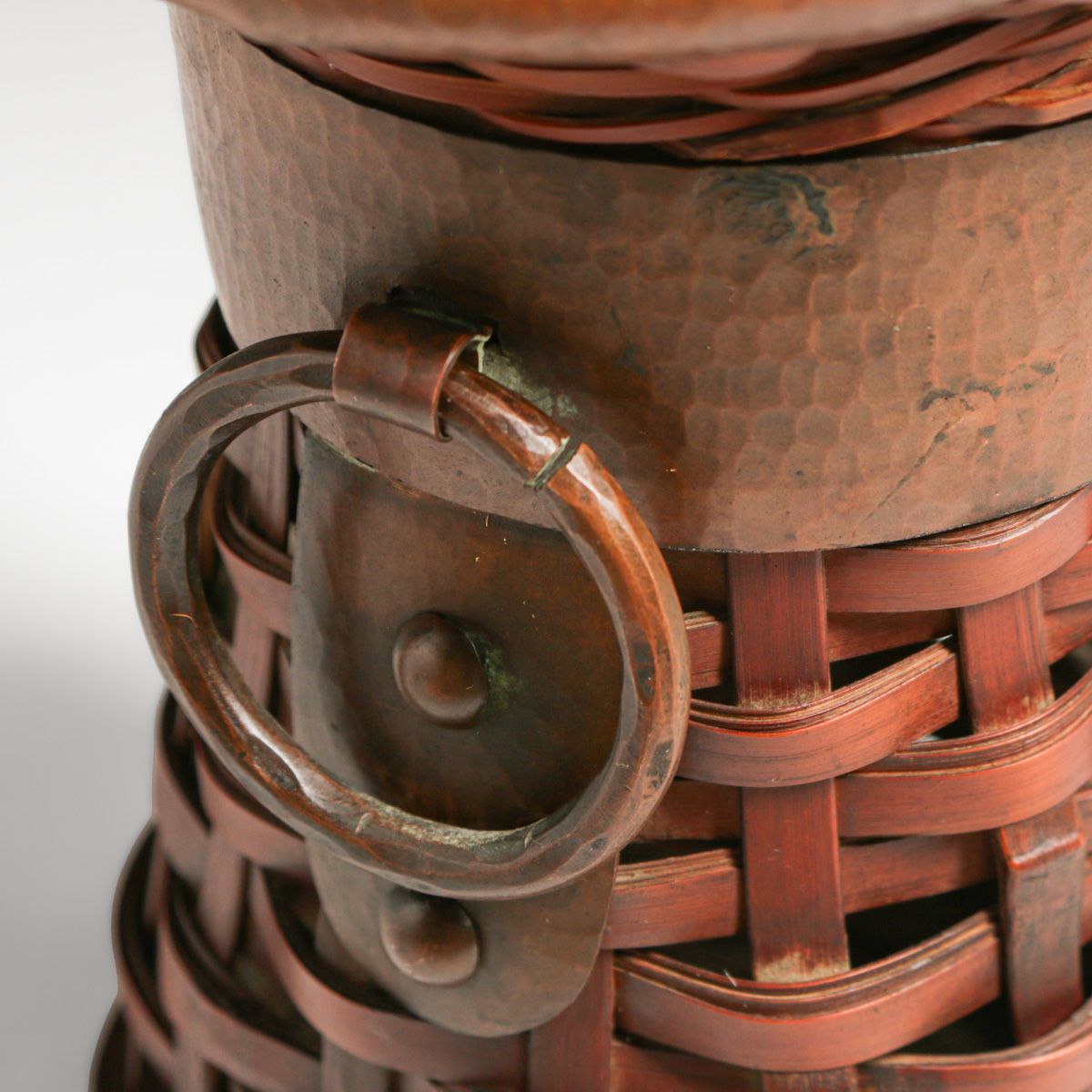 - Dirk van Erp Hammered Copper & Japanese Hand-Woven Bamboo Basket Vase c1917-1920