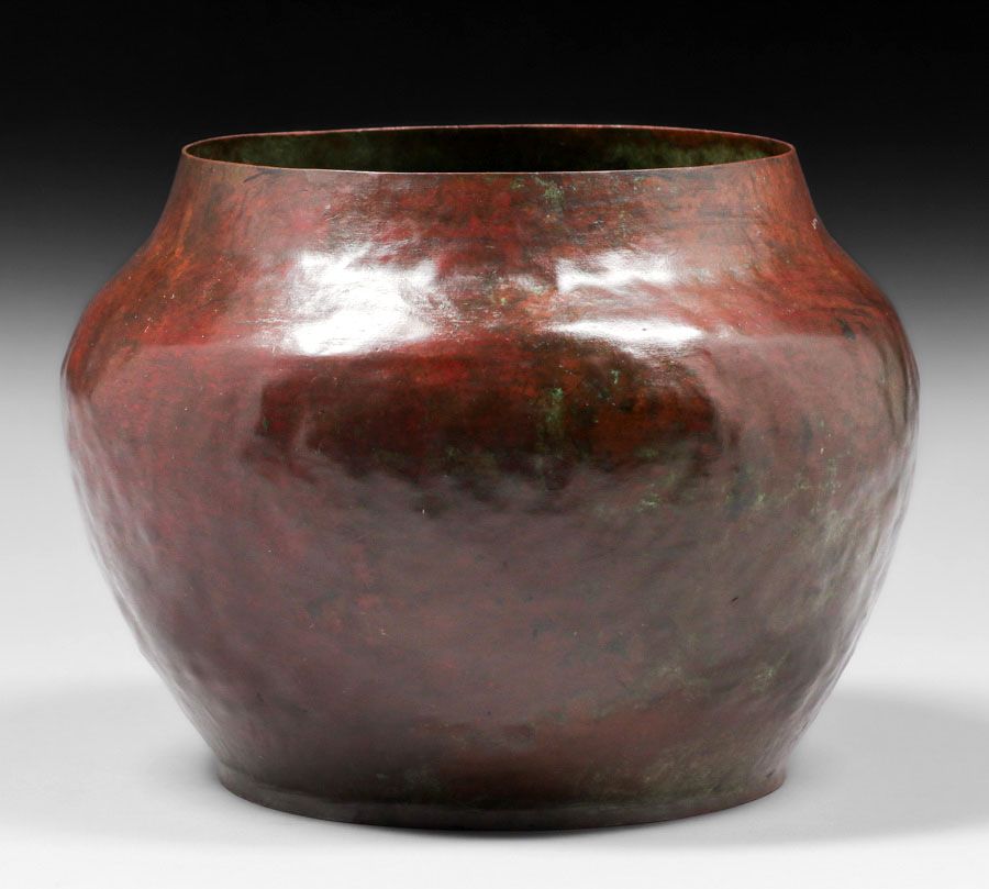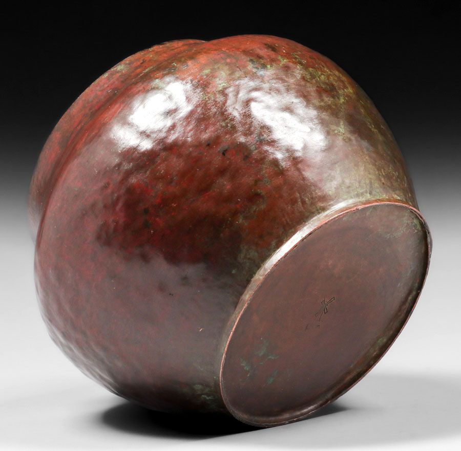 Dirk van Erp Hammered Copper Red Warty Vase c1913-1914. Signed with open-box mark. Excellent original red warty patina. 7.75″d x 5.75″h $7500