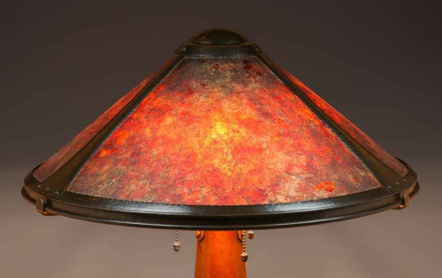 Dirk van Erp Hammered Copper Rivetbase Three-Socket Lamp c1915-1920. Signed with open-box, San Francisco mark. Excellent original patina and original mica. 23"h x 19"d SOLD