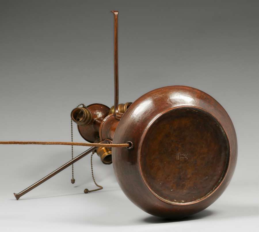 - Dirk van Erp Hammered Copper Rivetbase Three-Socket Lamp c1915-1920