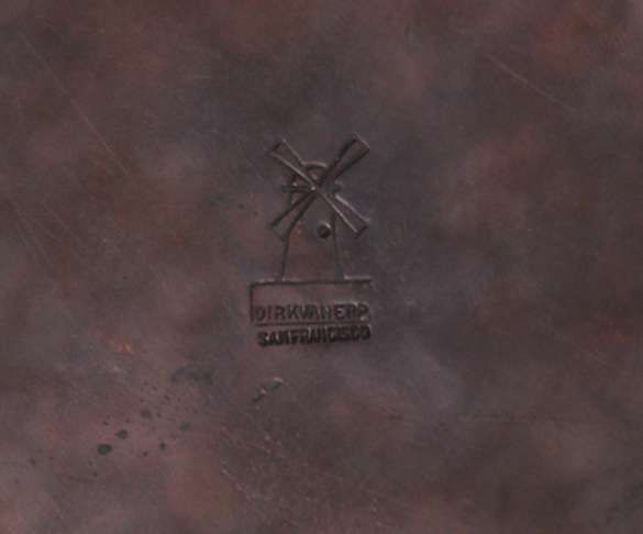 Dirk van Erp Hammered Copper & Stenciled Mica Boudoir Lamp c1920s. Excellent original patina and original stenciled mica. This is one of the best examples of stenciled mica that we have seen and mostly likely done by Agatha van Erp. Open-box, San Francisco mark. 11.5″h x 11″d SOLD