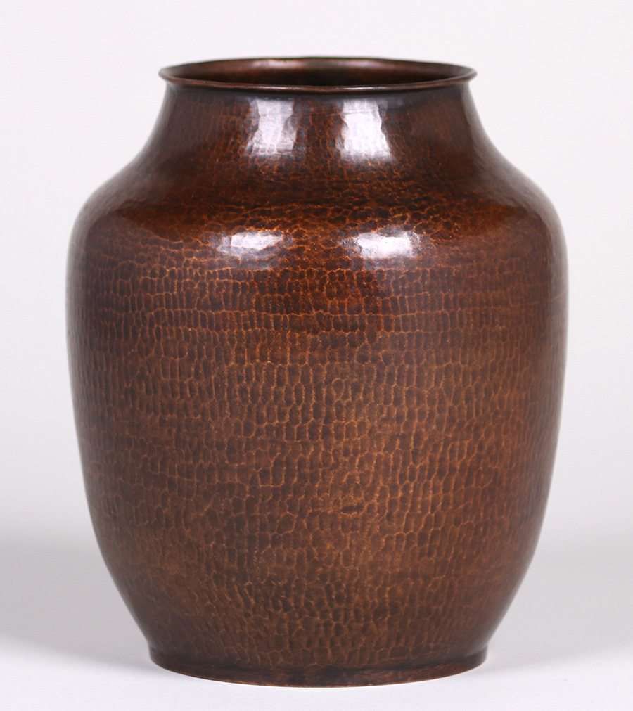 Dirk van Erp hammered copper vase with soft shoulder and slightly flared, rolled rim c1913-1914. Signed with open-box mark. Excellent new patina. 8 1/8"h x 6.5"d SOLD