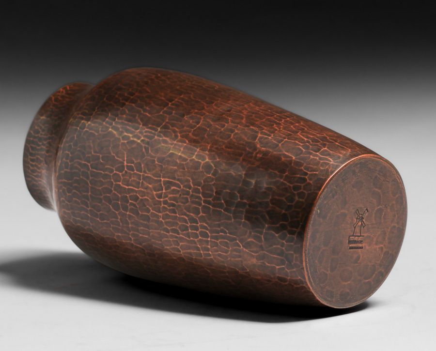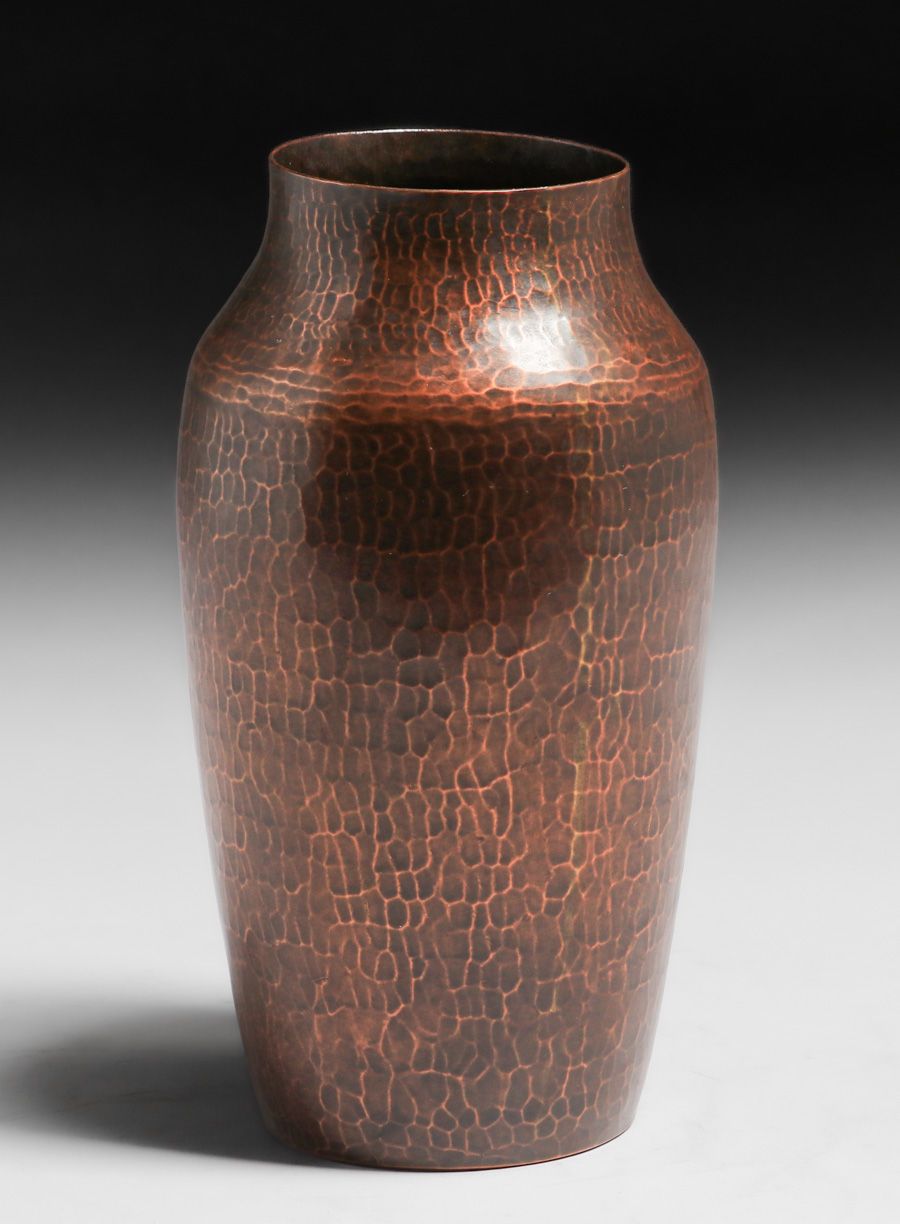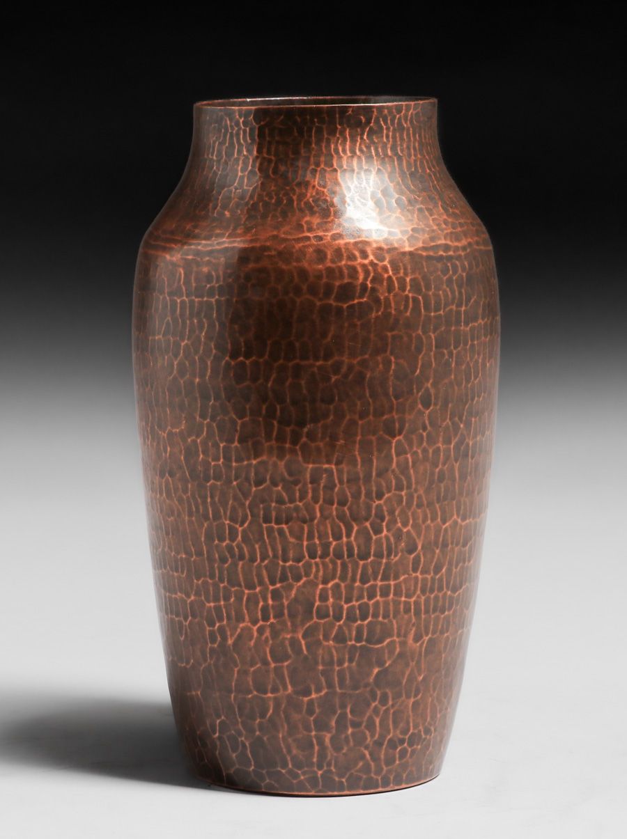 Dirk van Erp Hammered Copper Vase c1920s. Signed with open box, San Francisco mark. Excellent new patina. 8.5"h x 4.5"d SOLD
